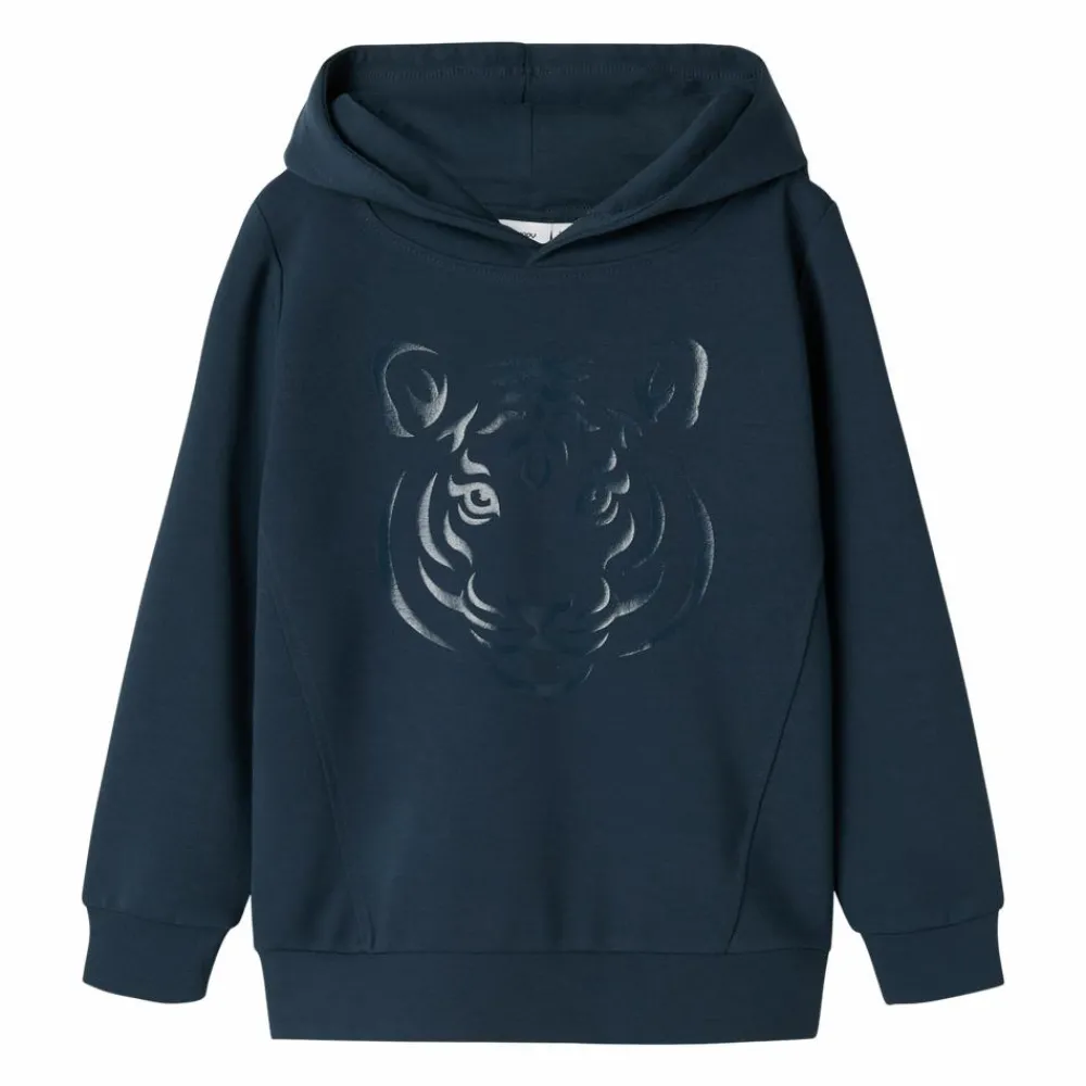Guppy hættetrøje med diskret print af et tiger hoved. Blød hoodie med flot print på fronten. Hættetrøjen har lange ærmer og ribkant ved håndled og talje.
