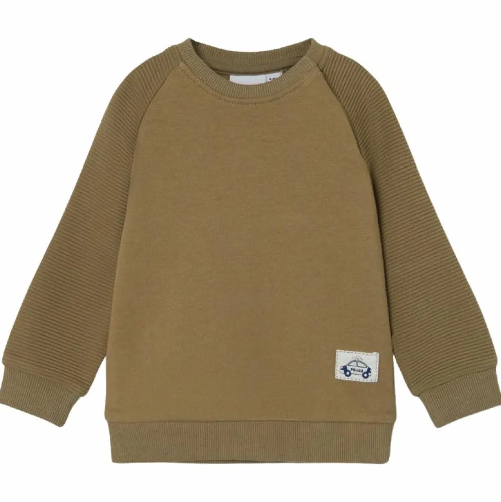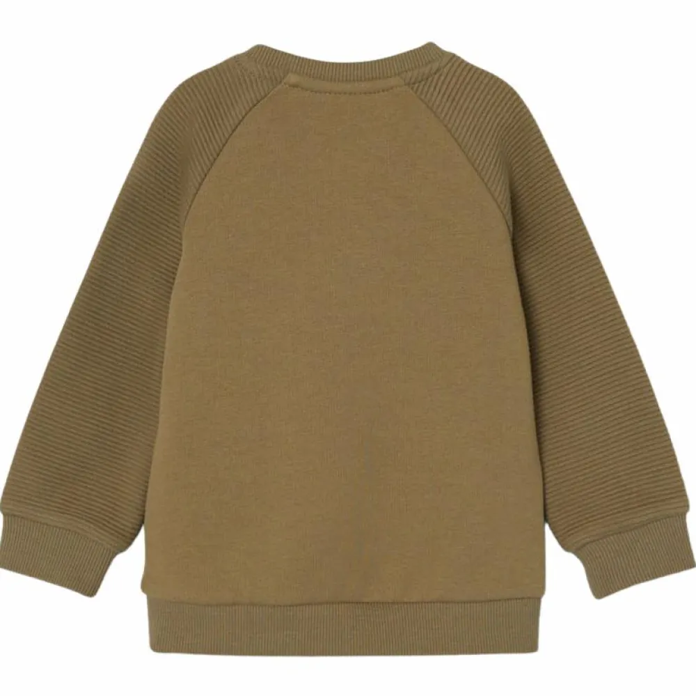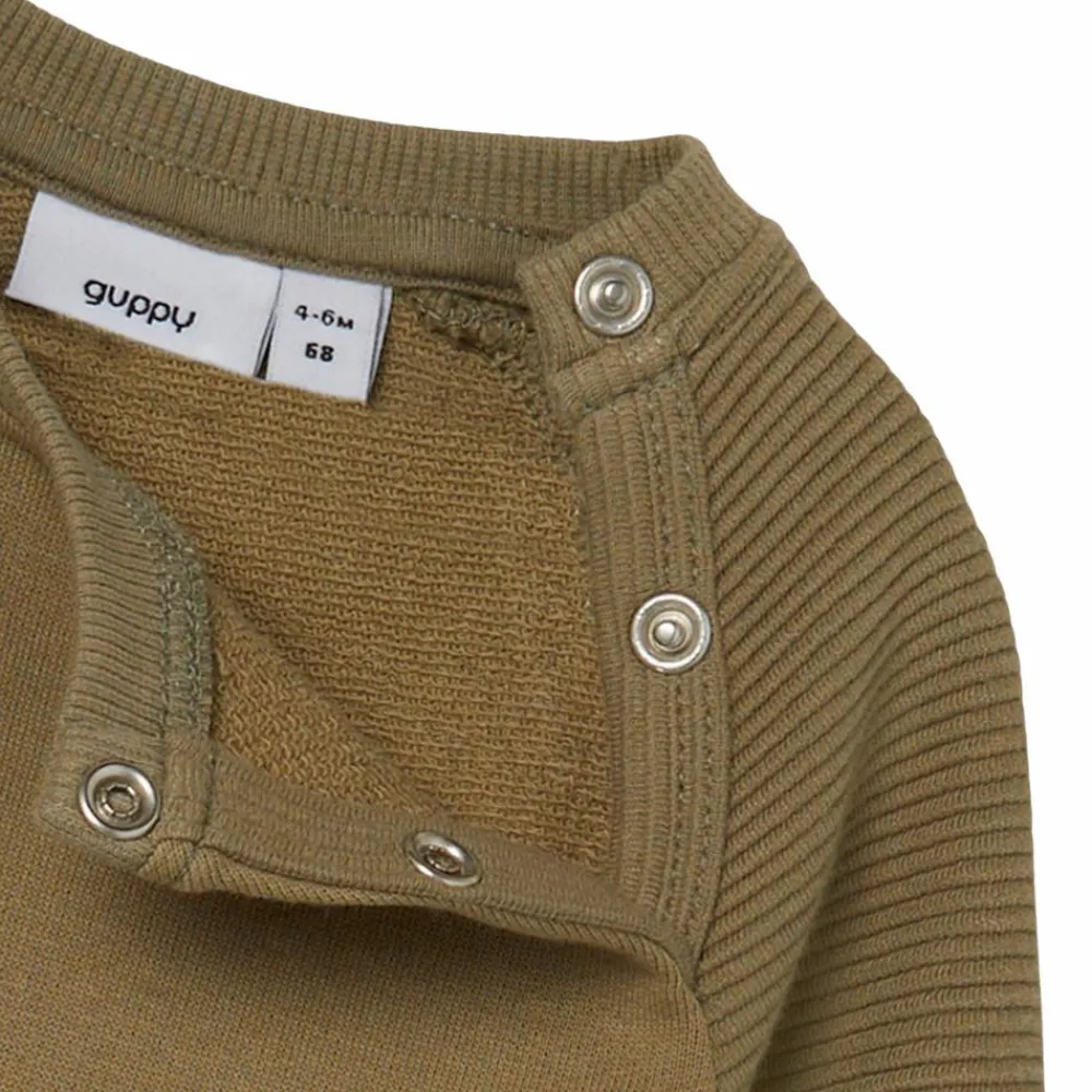 Guppy baby langærmet sweatshirt i grønlig nuance. Trøjen har rund halsudskæring, ribkant ved hals, ærme og bund. Den lukkes ved den ene skulder med to trykknapper.