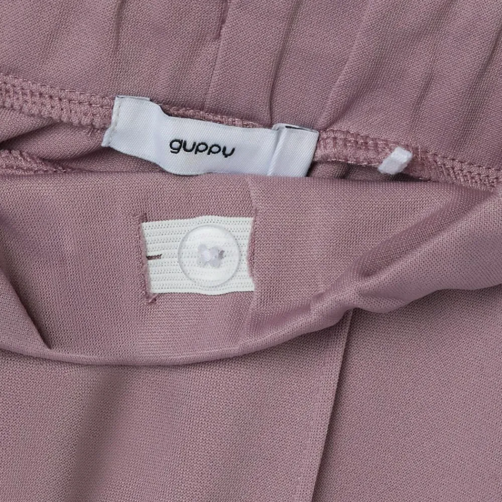 Guppy bukser til pige, i et sporty look. Bukserne har en sart lavendel farve med en hvid kontrast stribe langs siderne samt en pressefold midt på benene. Taljen har elastik og er justerbar.