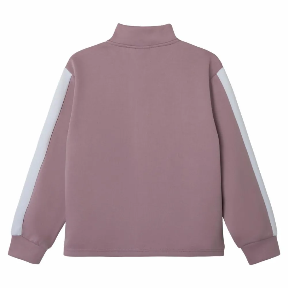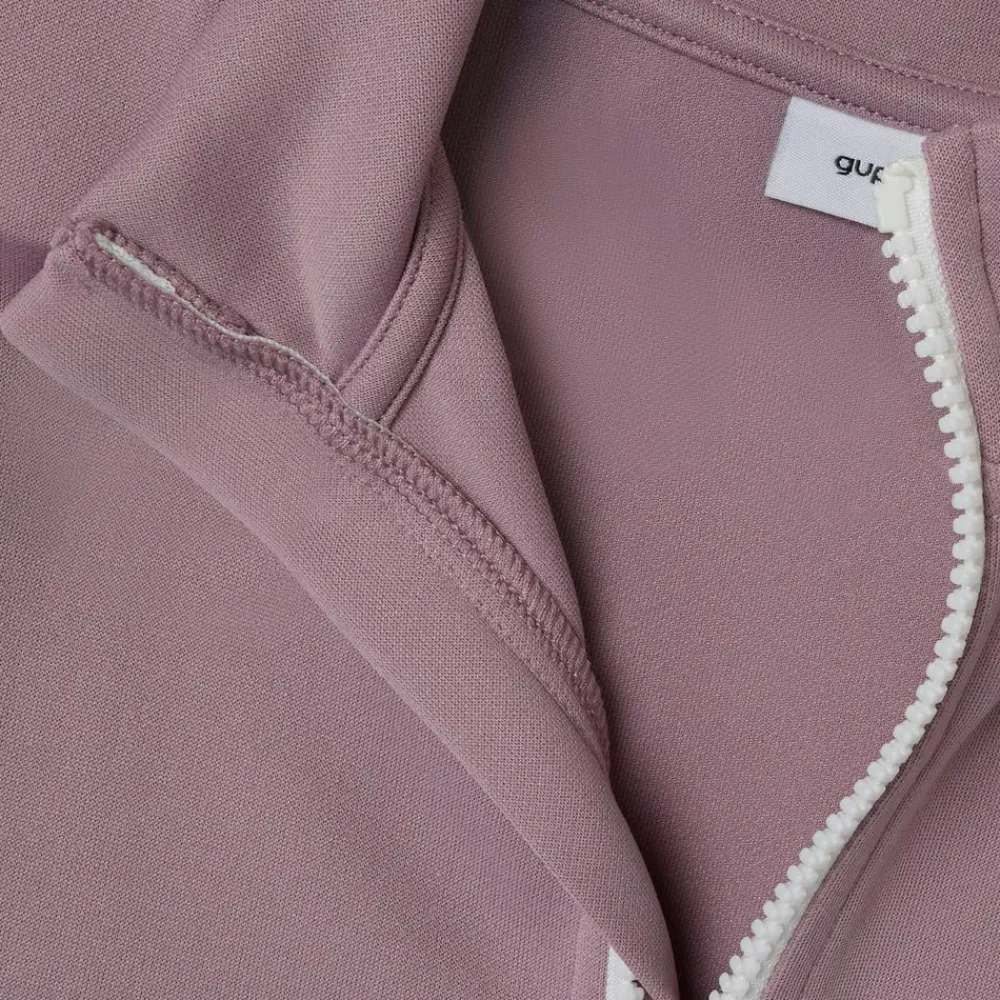 Guppy trøje med lynlås og høj hals. Trøjen har en sart lavendel farve med en hvid kontrast stribe langs ærmerne og et sporty look.