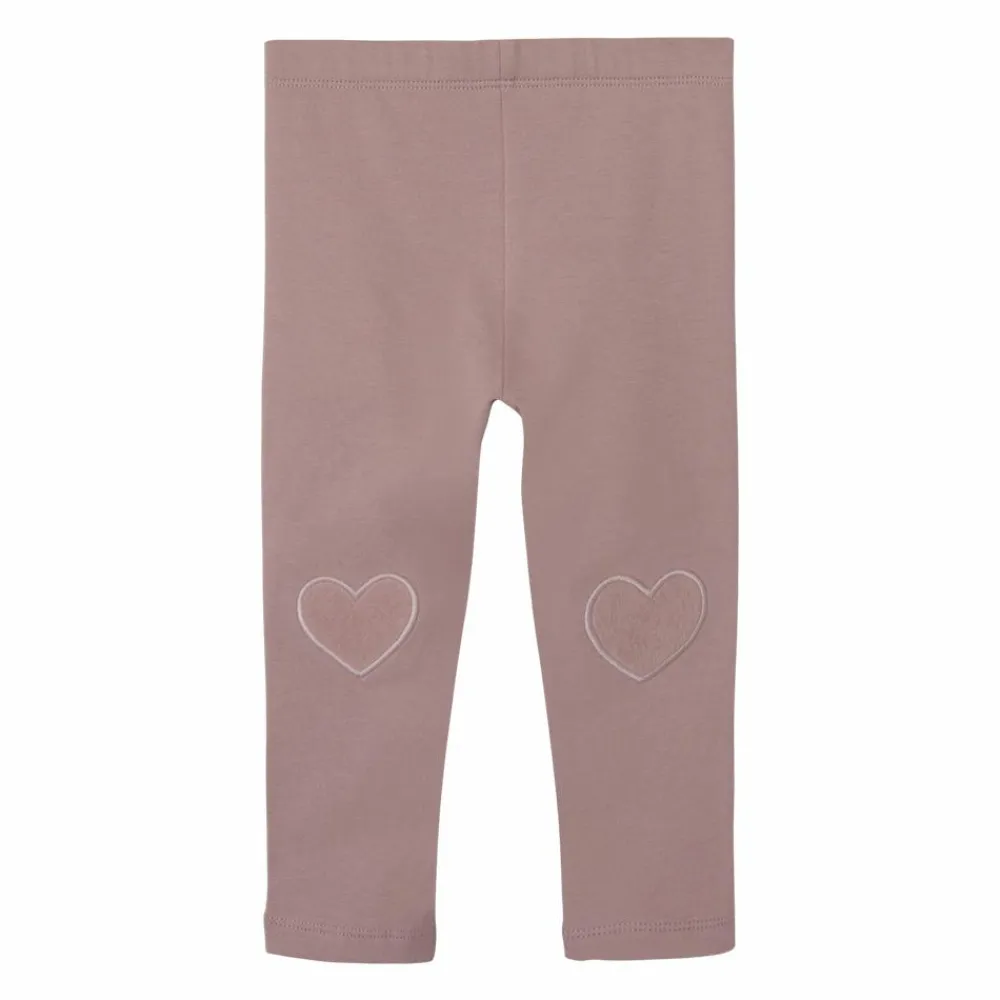 Guppy leggings til baby med søde påsatte filt hjerter ved knæene. Disse leggings kommer i en lækker blød kvalitet med en børstet inderside, som gør dem ekstra behagelige for barnet at have på.