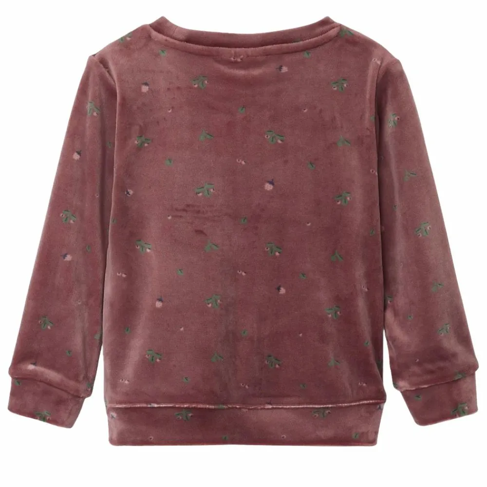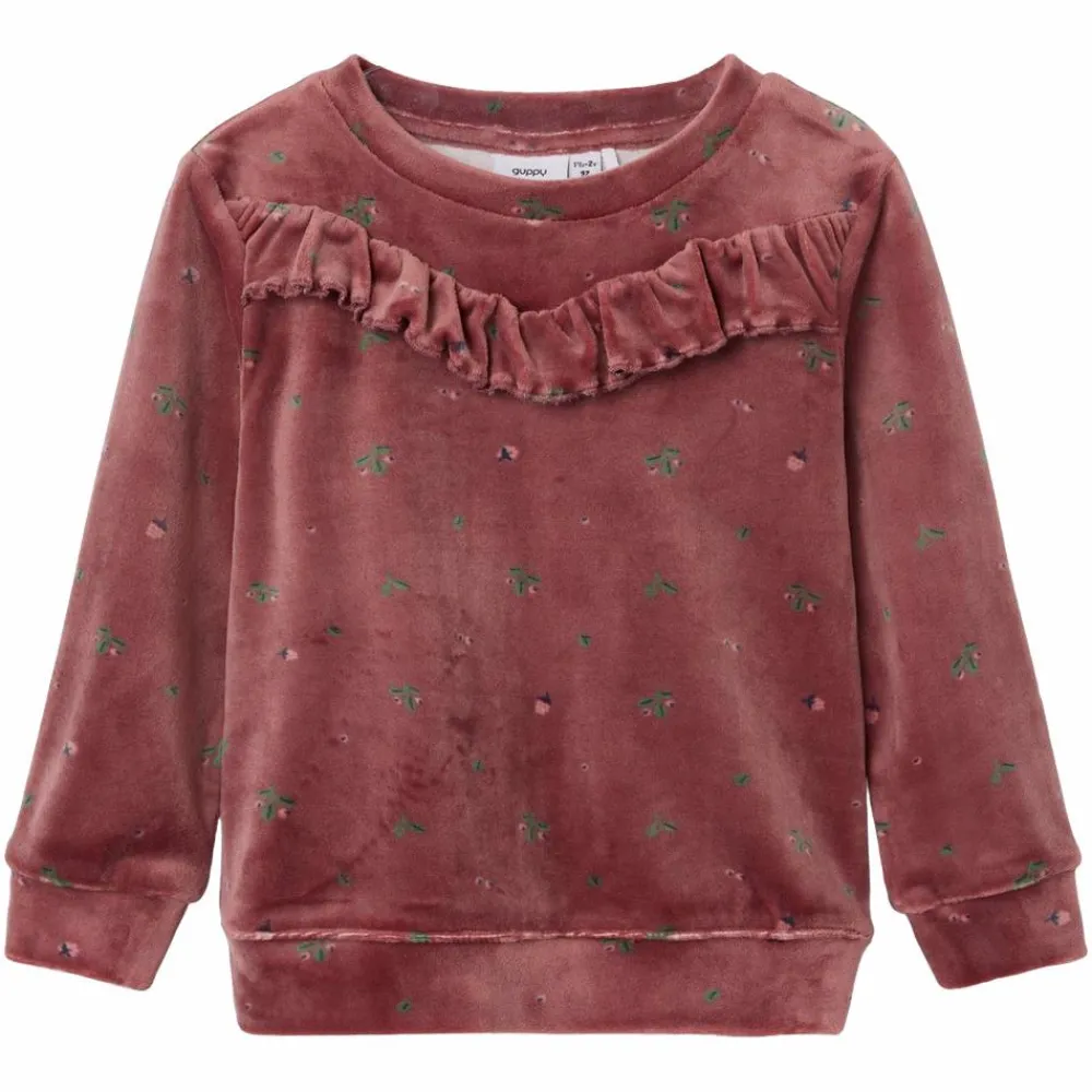 Guppy pige bluse i velour med enkelt mønster. Trøjen har lange ærmer, flæse detaljer på fronten, samt rund halsudskæring.
