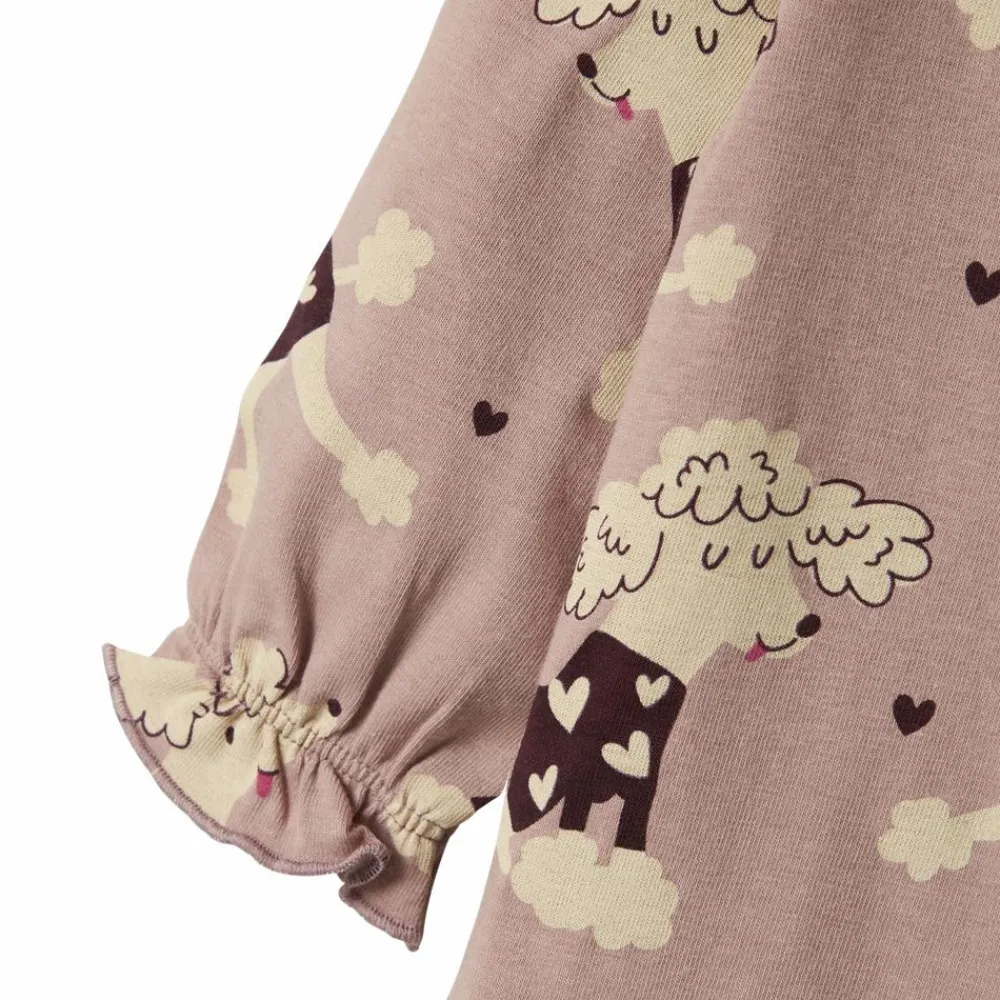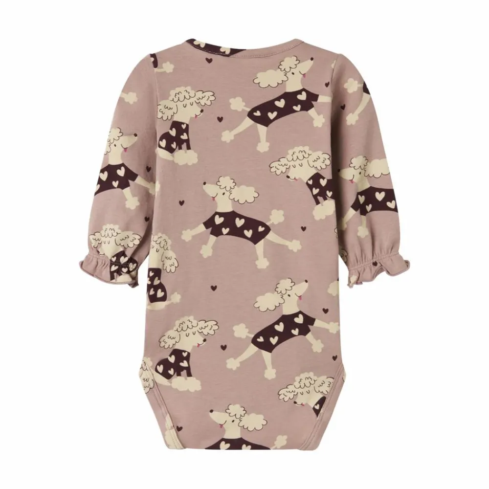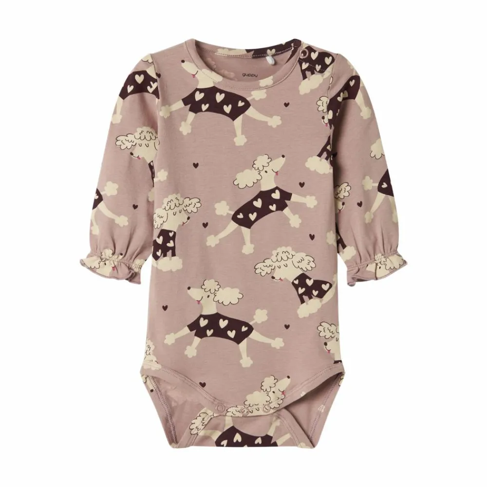 Guppy baby body til pige med all-over print. Bodyen har 3/4 lange ærmer, som sluttes af med elastik, som giver en sød detalje med rynk. Den har en rund halsudskæring og lukkes med trykknapper ved den ene skulder samt mellem benene.