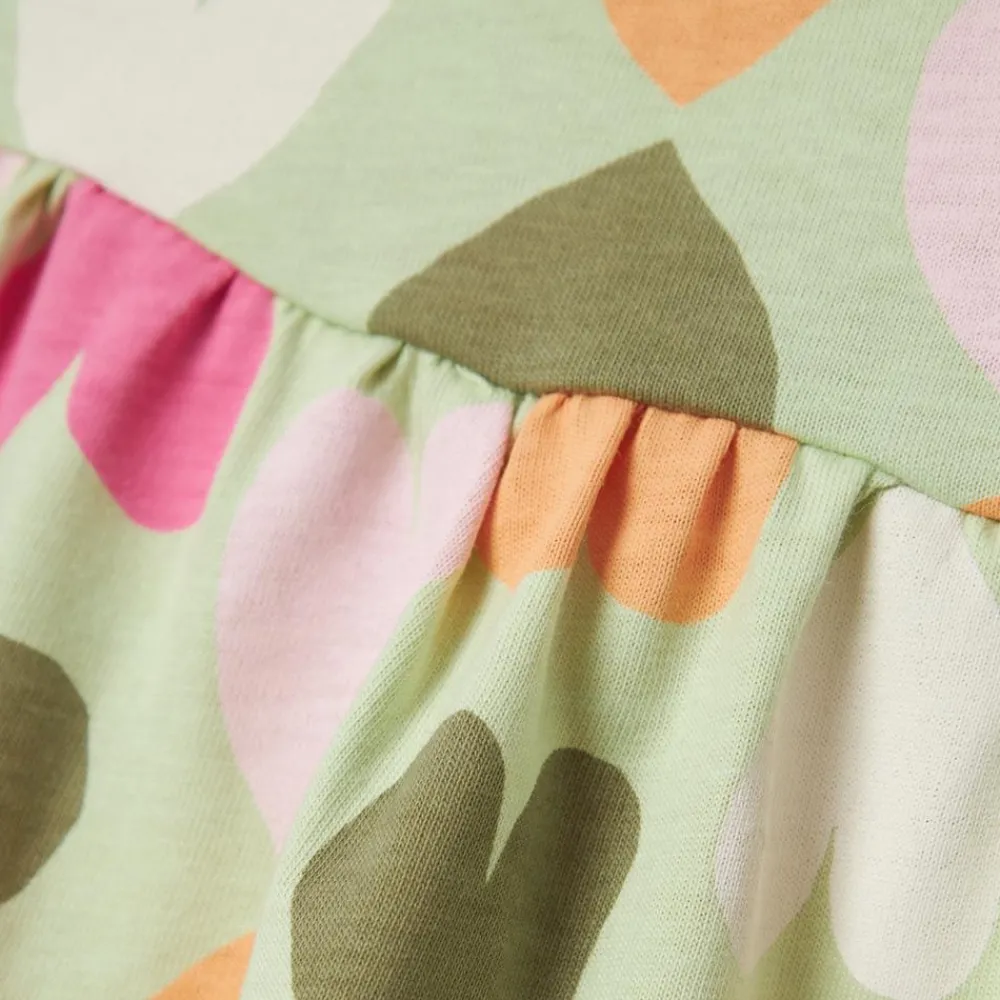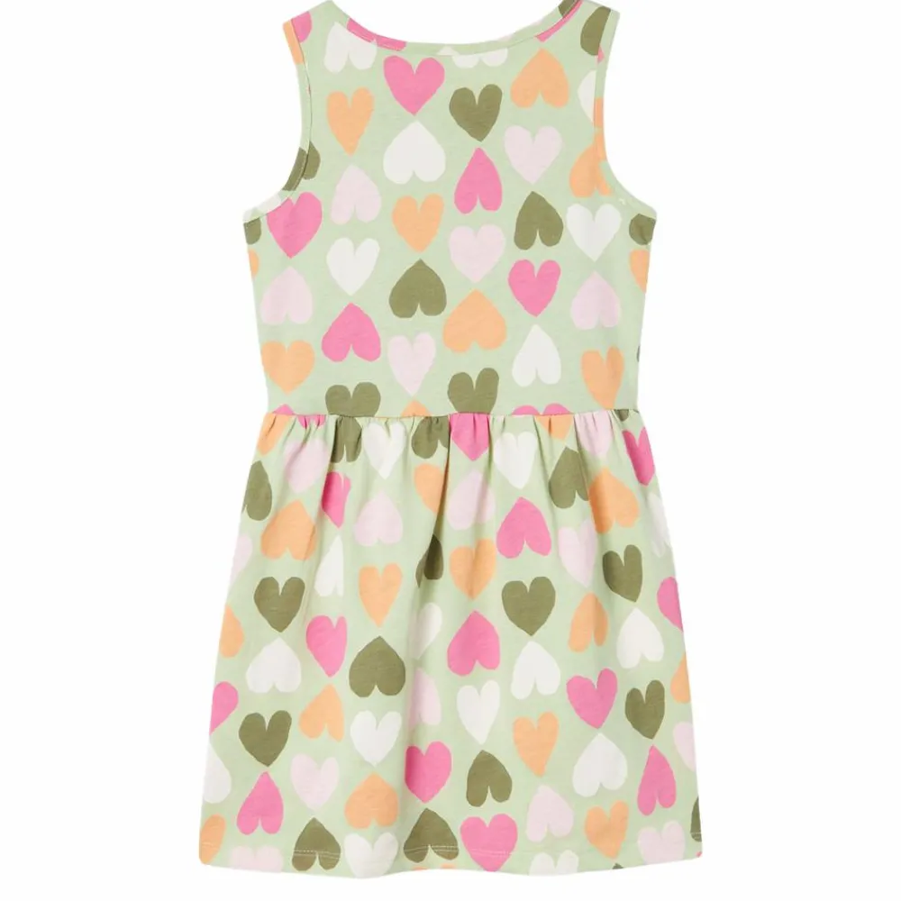Pige kjole med all over print bestående af forskelligt farvede hjerter. Kjolen har rynkesamling i taljen samt rund halsudskæring.