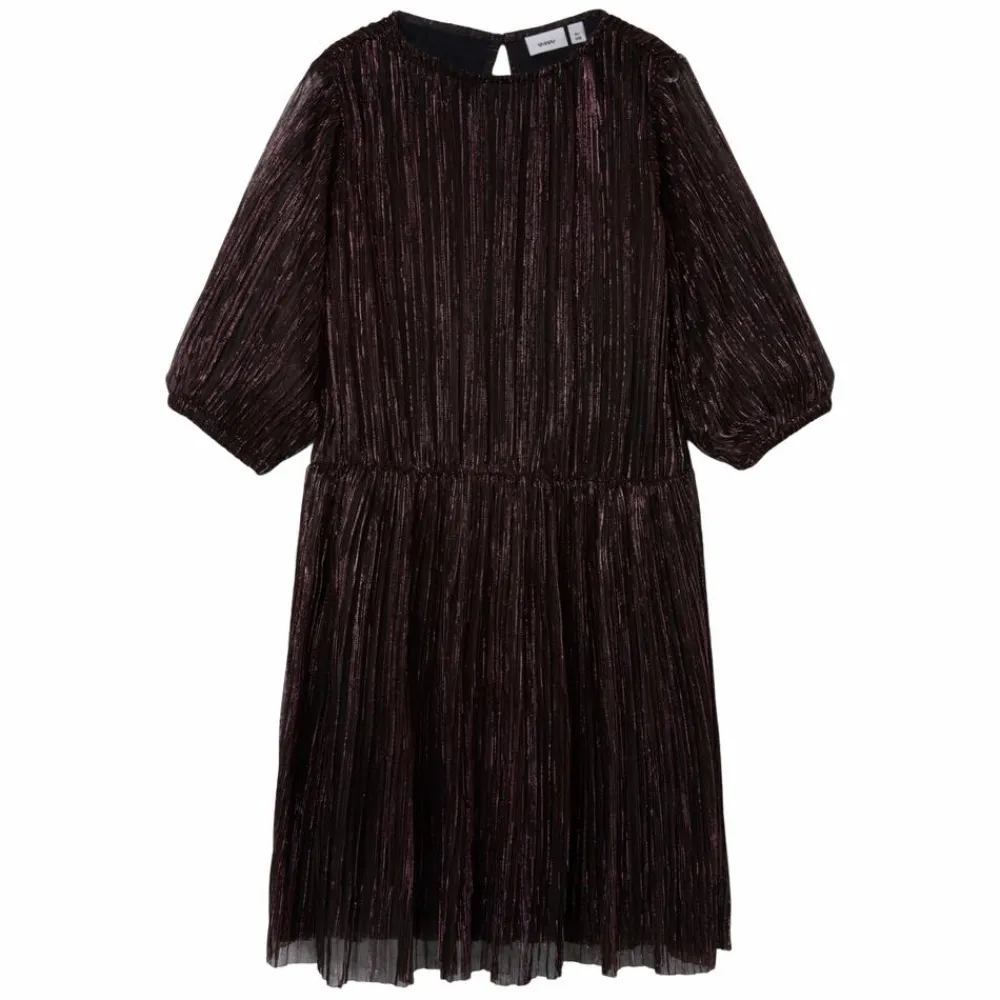 Guppy pige glimmer kjole med trekvartærmer og elastik. Kjolen har rund halsudskæring som lukkes i nakken med en lille knap samt elastik i taljen, som giver en fin pasform. Der er påsyet underkjole.