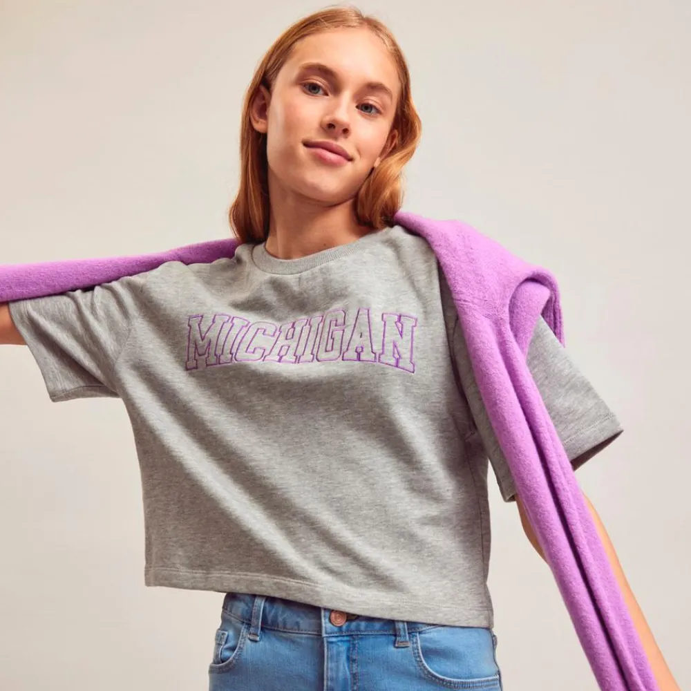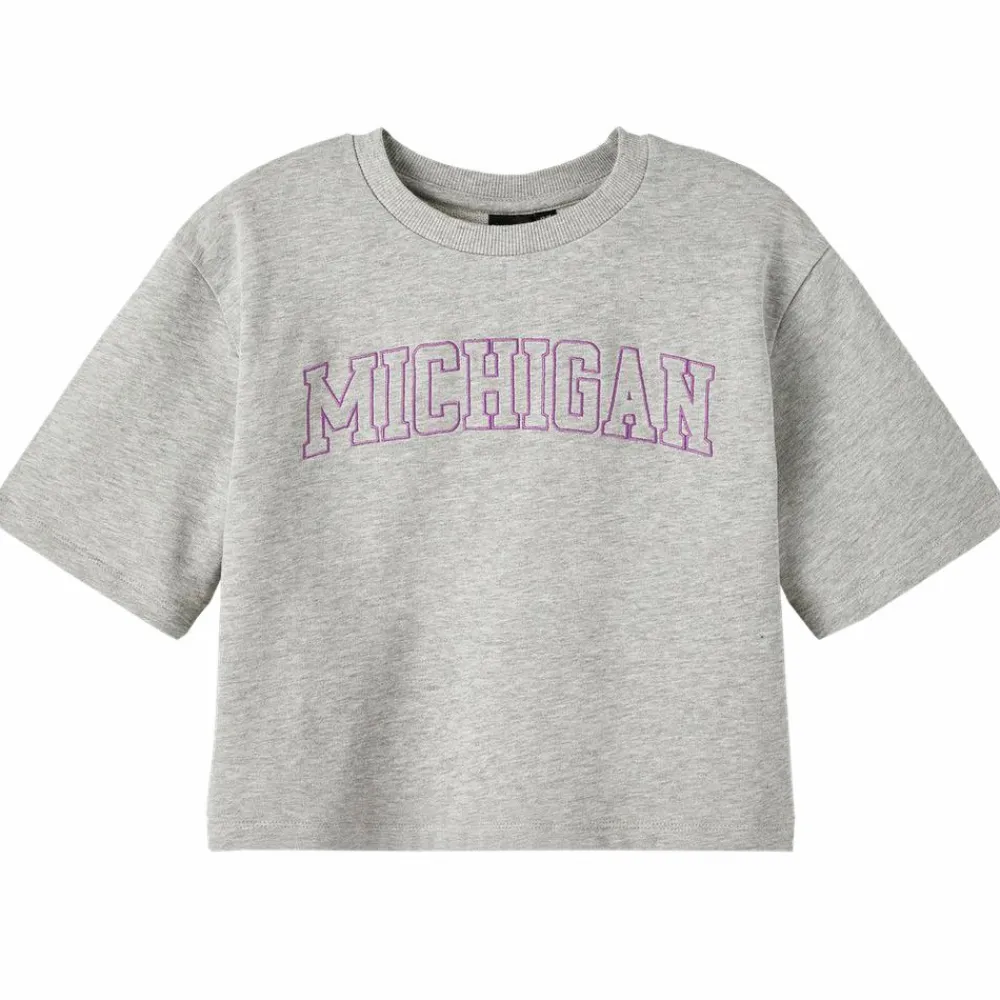 LMTD tween pige crop t-shirt. T-shirten er broderet på fronten, samt rund halsudskæring med en lille ribkant. T-shirten har pasform som er crop, som gør at den er kort.