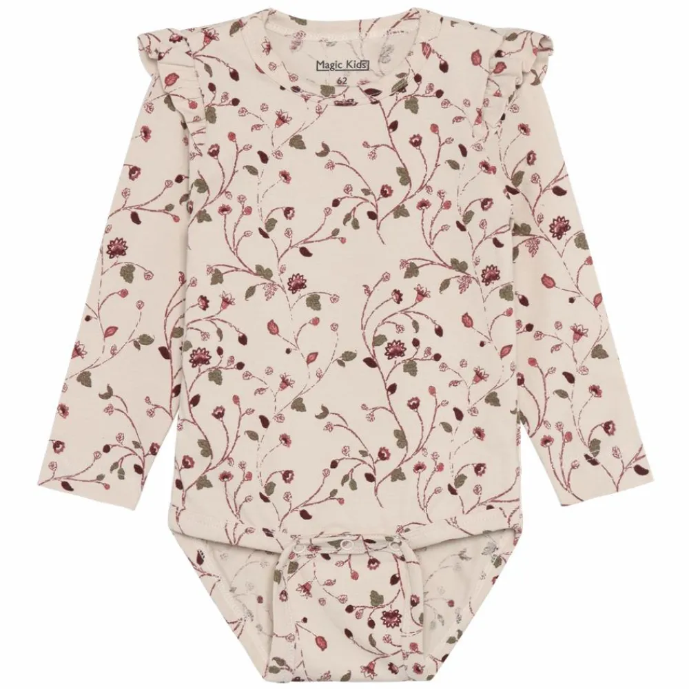 Magic Kids langærmet baby body med all over print og flæser på skulder. Bodyen er lavet i en blød, åndbar bomuldskvalitet. Den er designet med praktiske trykknapper ved benene.