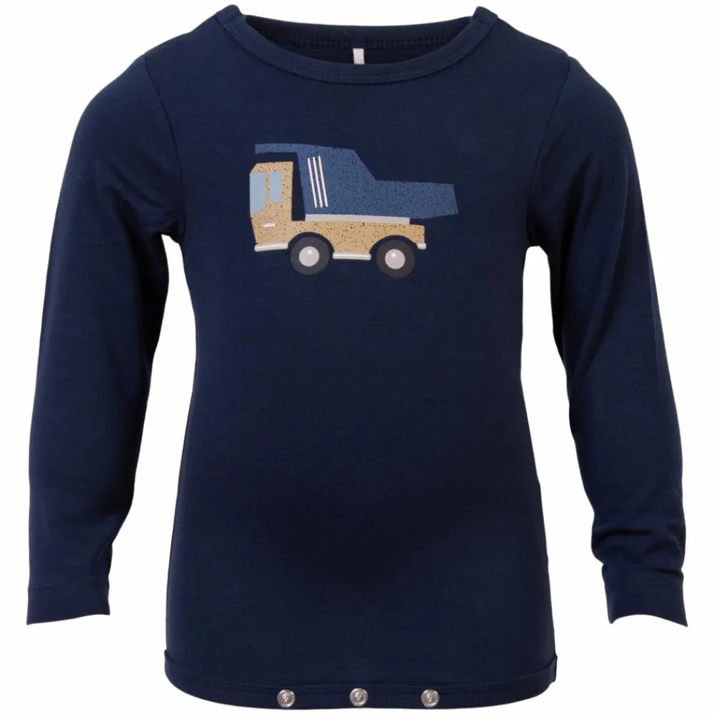 Baby body i ensfarvet mørkeblå med lastbil print.