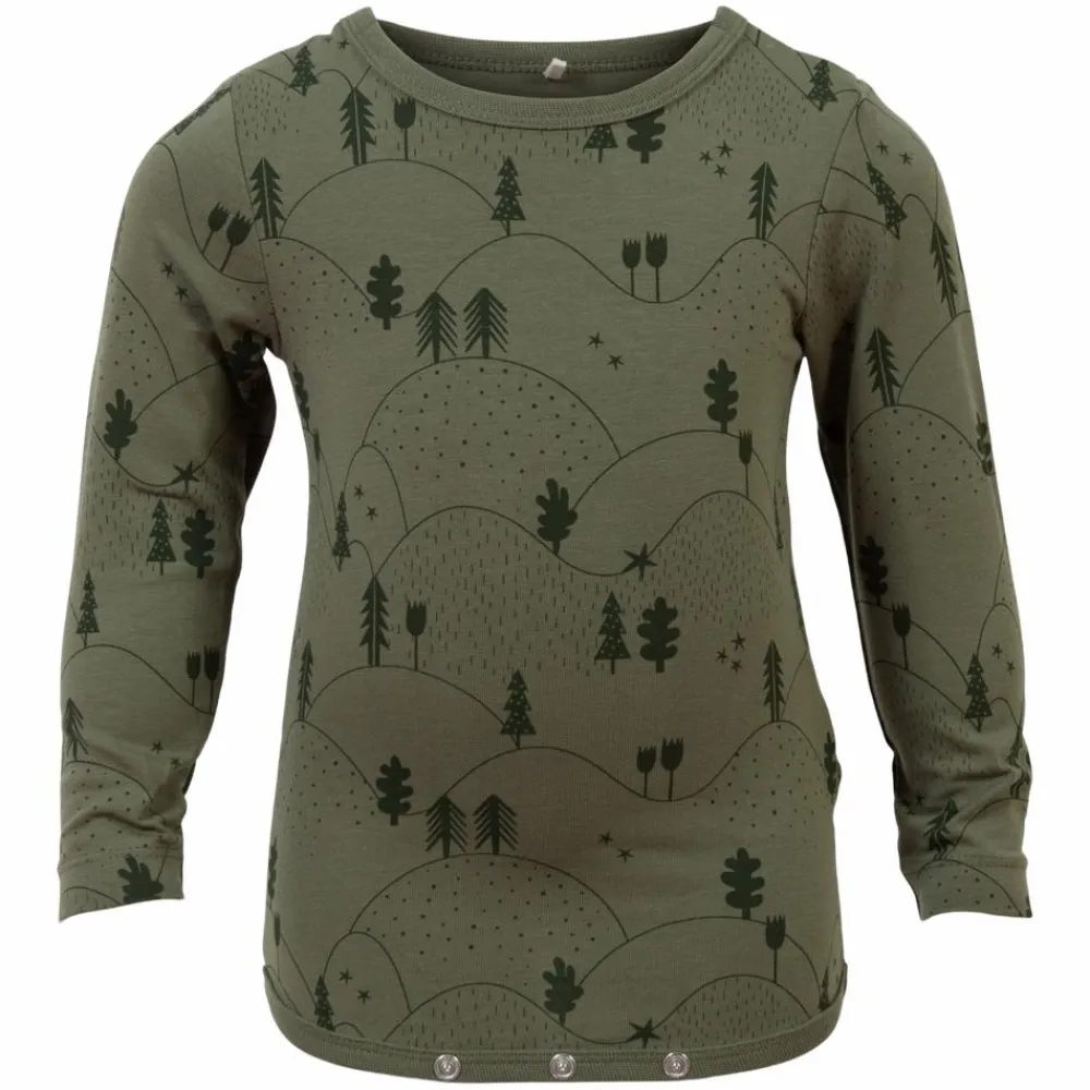 Me Too baby langærmet body med all-over print. Bodyen lukkes med to trykknapper ved både højre og venstre skulder samt tre trykknapper mellem benene.