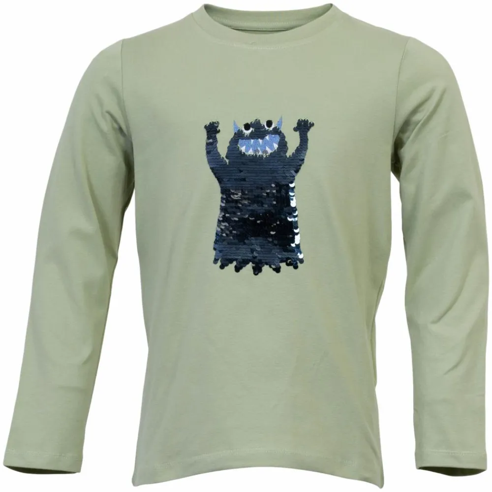 Me Too langærmet t-shirt i grøn farve. Trøjen har et sort palliet-mønster på fronten. Pallieterne har en sølv bagside.