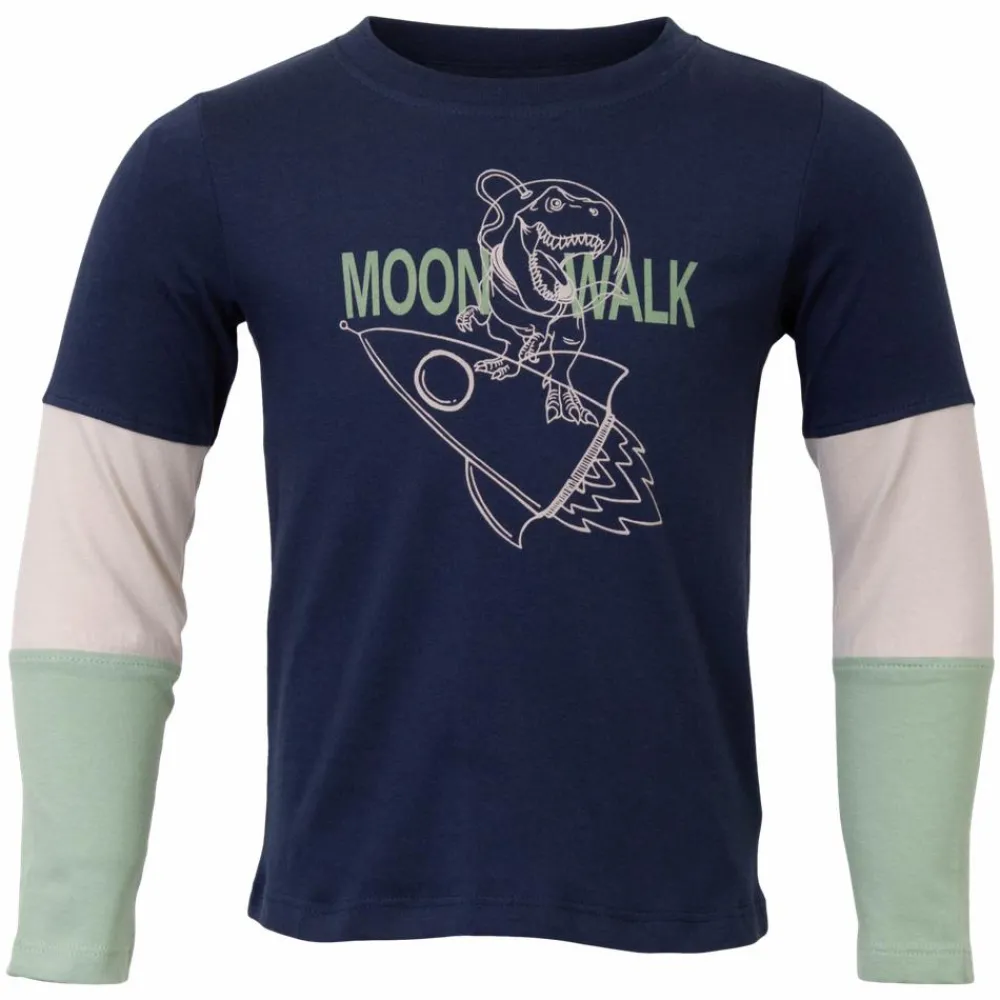 Langærmet bluse med dinosaur print samt tre-farvede ærmer.