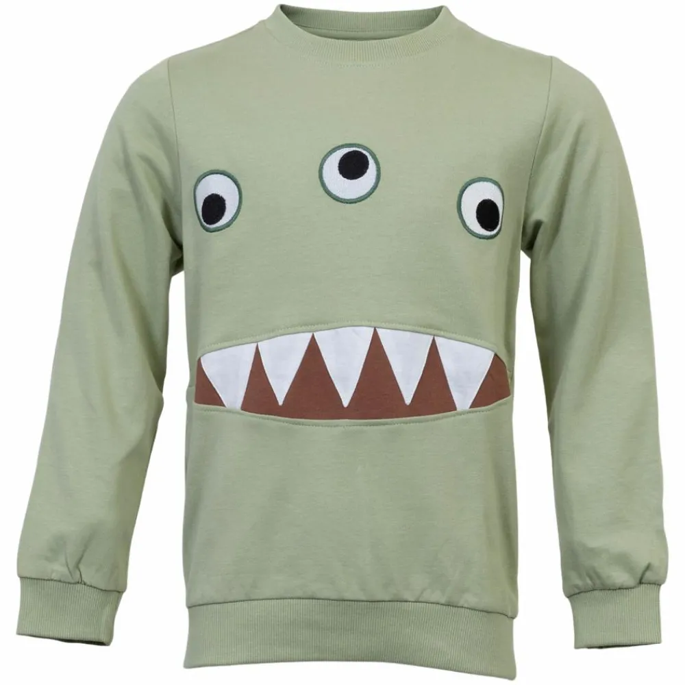 Me Too sweatshirt med monster design. Trøjen har broderet øjne, med en grøn kant. Trøjen har lange ærmer med ribkanter ved halsen, ærmerne og nederste kant.