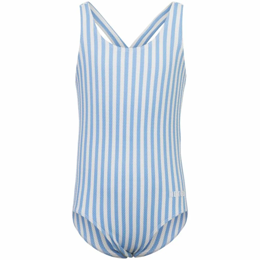 Me Too badedragt til juniorpigen. Den flotte badedragt til piger har et fint og feminint udtryk med det gennemgående stribeprint i dejlige sommerfarver. Badetøjet fra Me Too har normal pasform og den bløde kvalitet føles behagelig mod barnets krop. Badedragten har et diskret logo på fronten ved hoften.