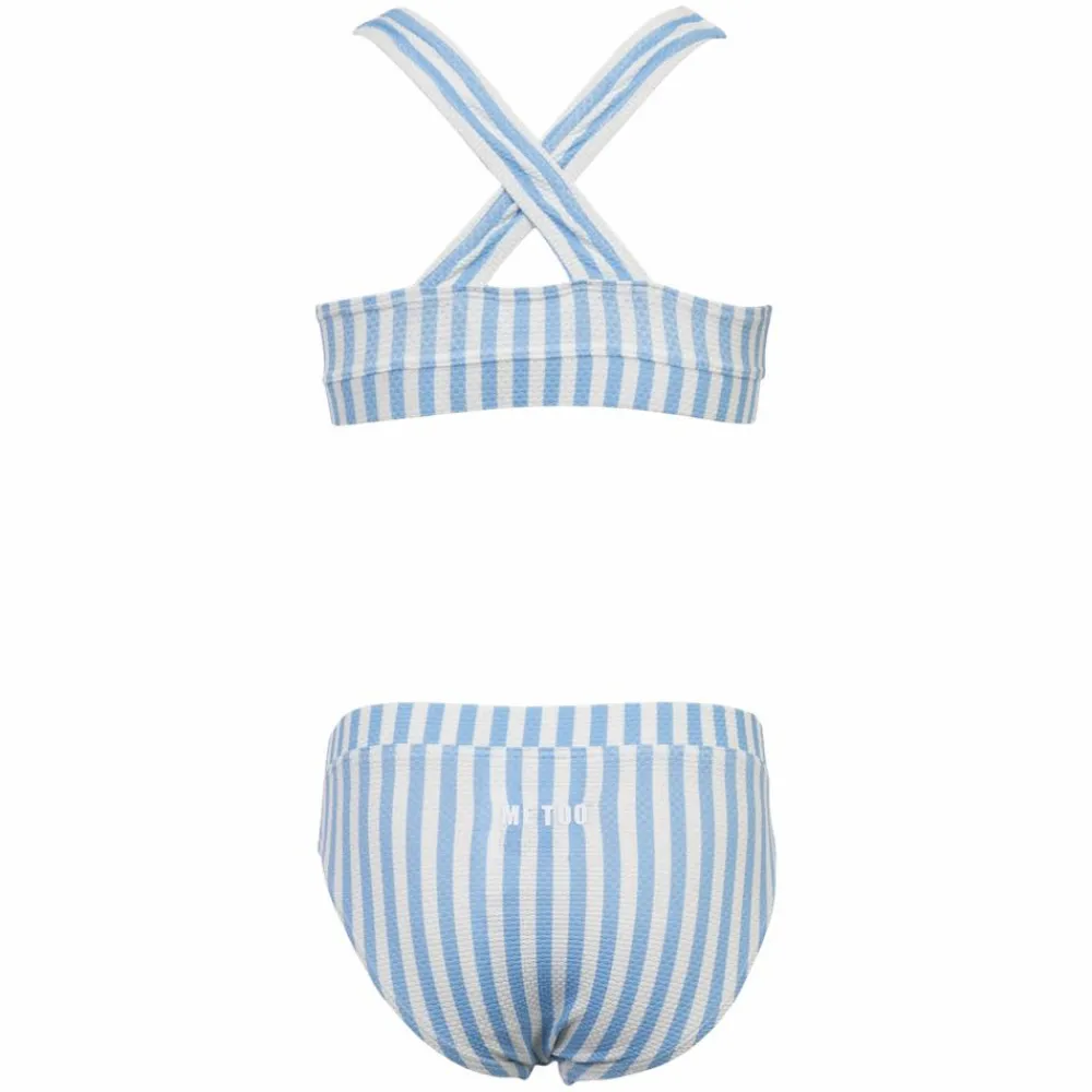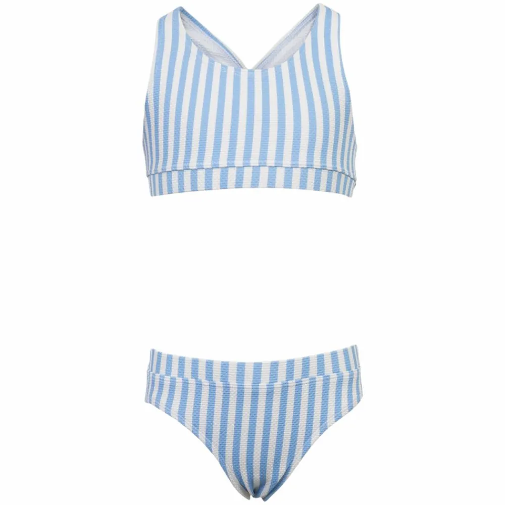 Me Too bikini til juniorpigen. Den flotte bikini til piger har et fint og feminint udtryk med det gennemgående stribeprint i dejlige sommerfarver på både bikinitop og bikinitrusser. Badetøjet fra Me Too har normal pasform og den bløde kvalitet føles behagelig mod barnets krop. Bikinitrussen har et diskret logo bagpå.