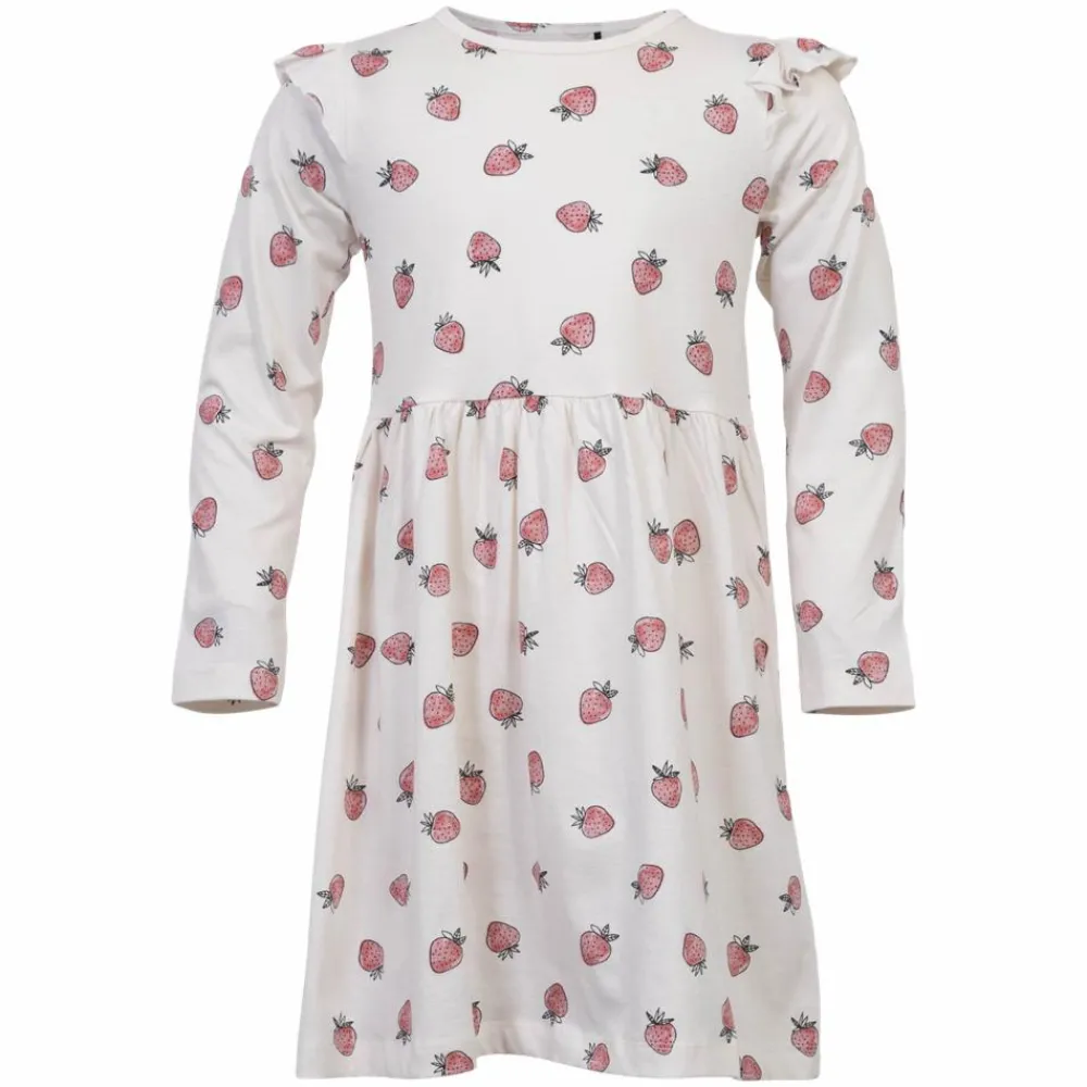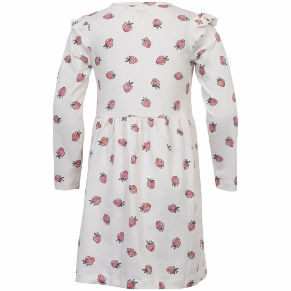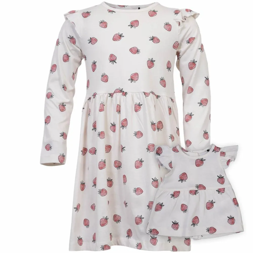 Me Too kjole med all-over print. Kjolen har lange ærmer og flæser på skulderne. Kjolen har en syning i livet, og et V-formet skørt. Der medfølger en matchende dukkekjole.