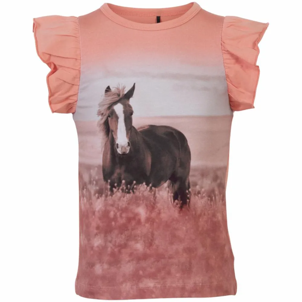 Bluse med heste print på fronten, rund halsudskæring samt flæser som ærmer.