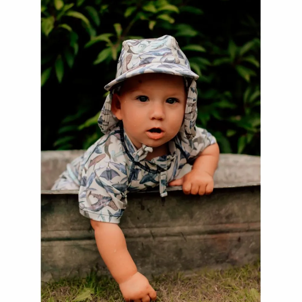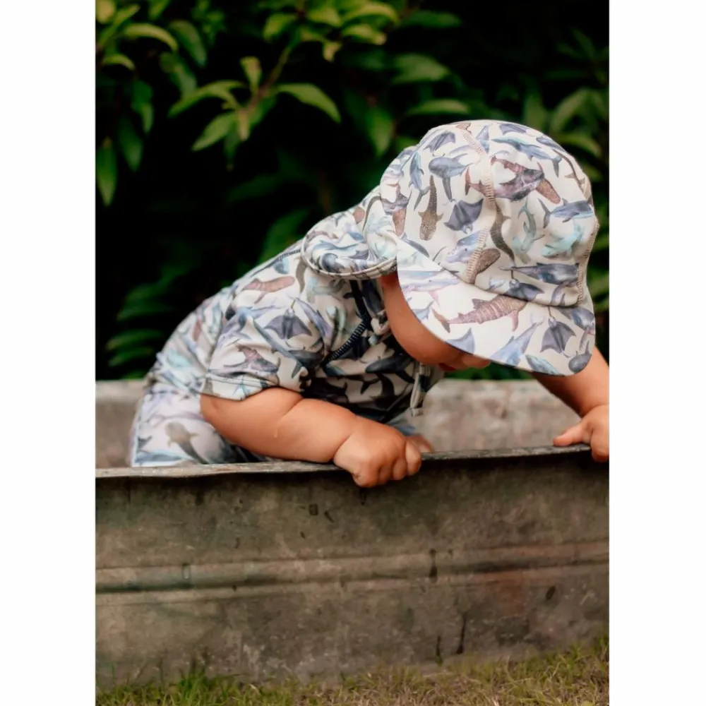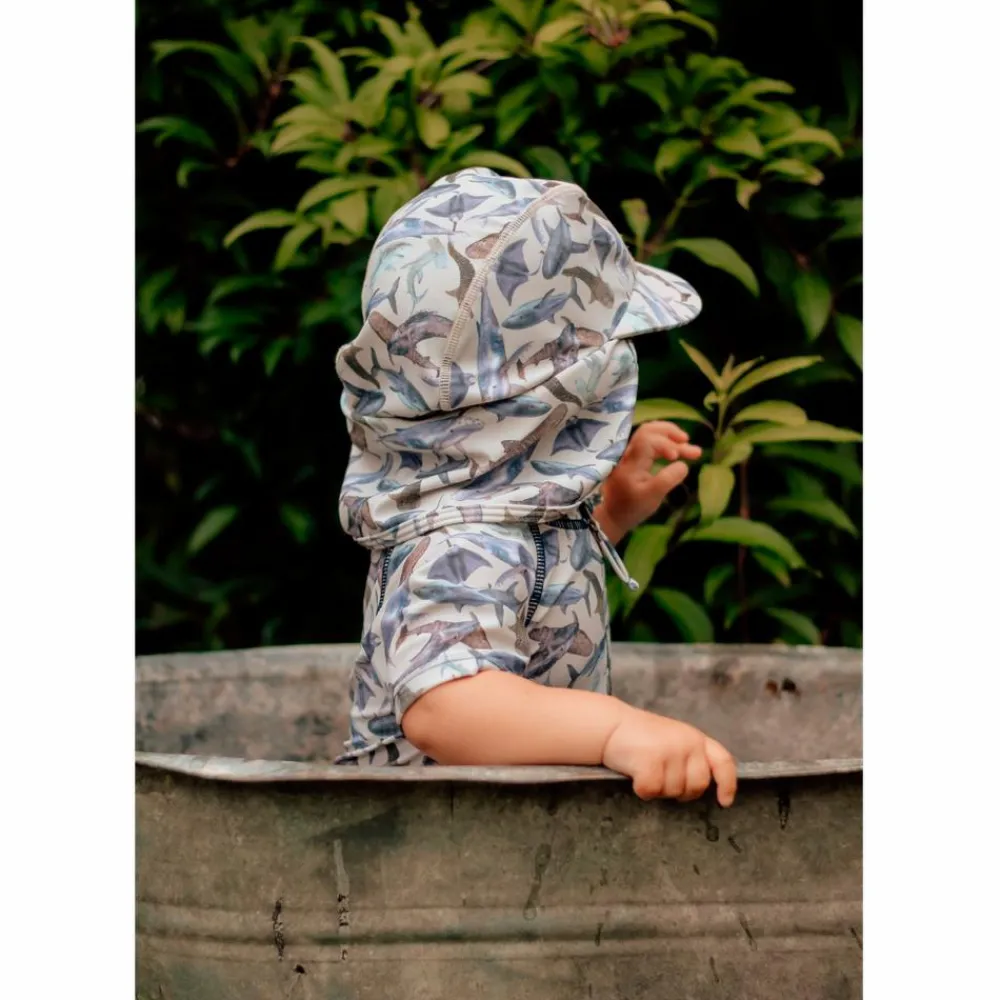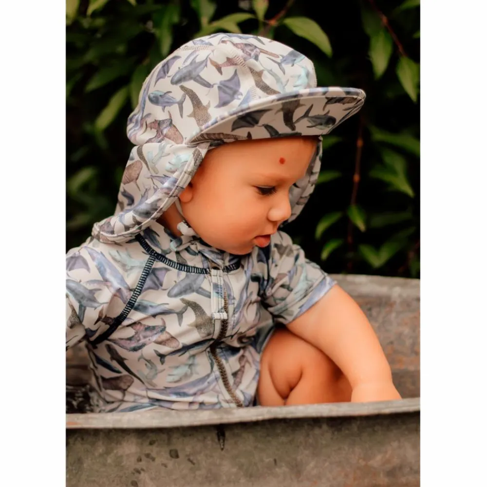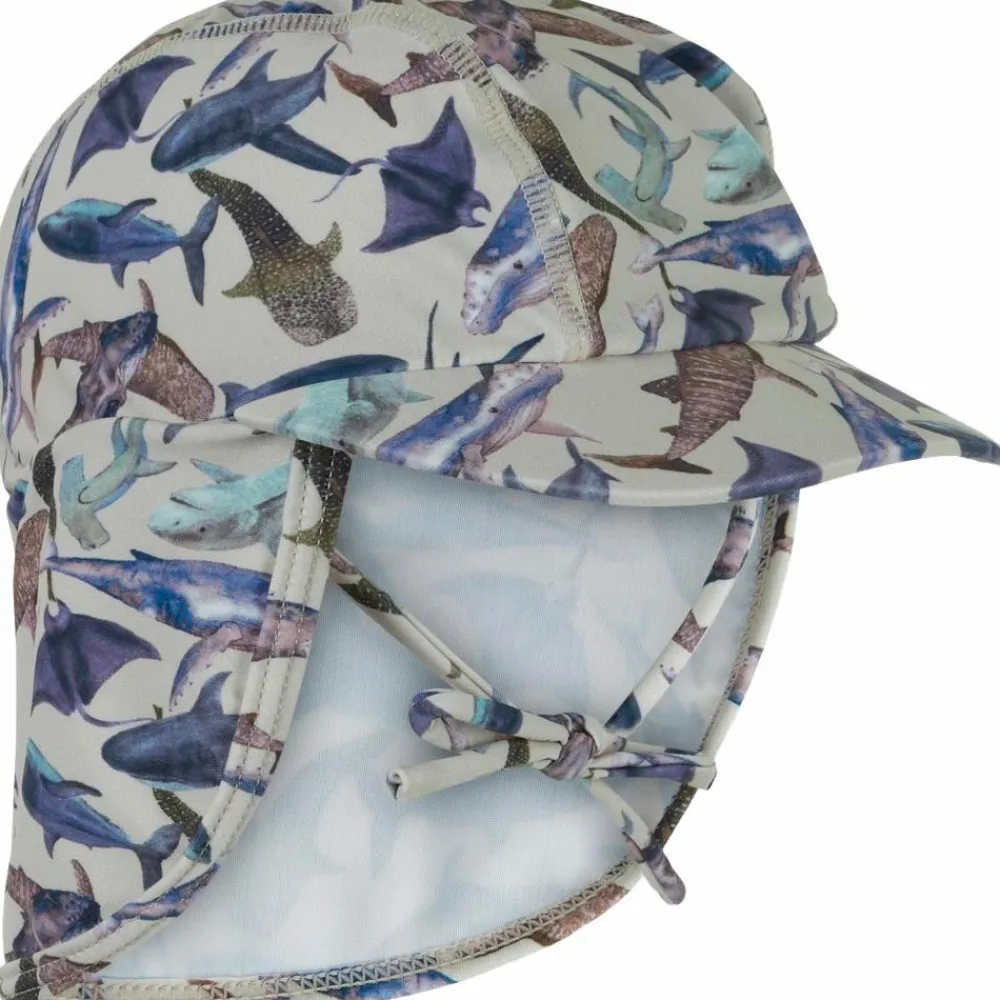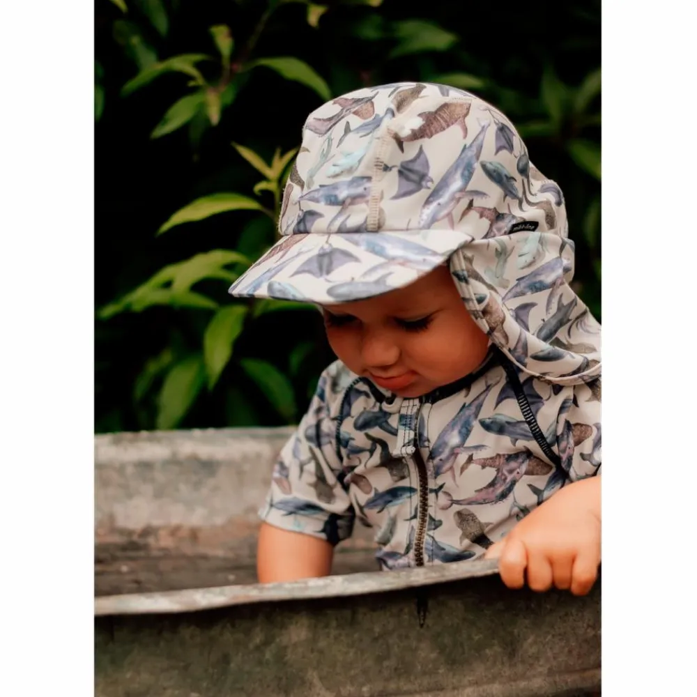 Mikk-line baby badehat. Badehatten har en rund hovedform med bindesnore, som bindes i en sløjfe under hagen. I nakken er der en elastikindsats, der giver en god pasform. Badehatten har en flad kasketskygge fortil samt en skygge bagtil, som dækker nakken. Badetøjet tåler vand og tørrer hurtigt, samt beskytter i mod solen.