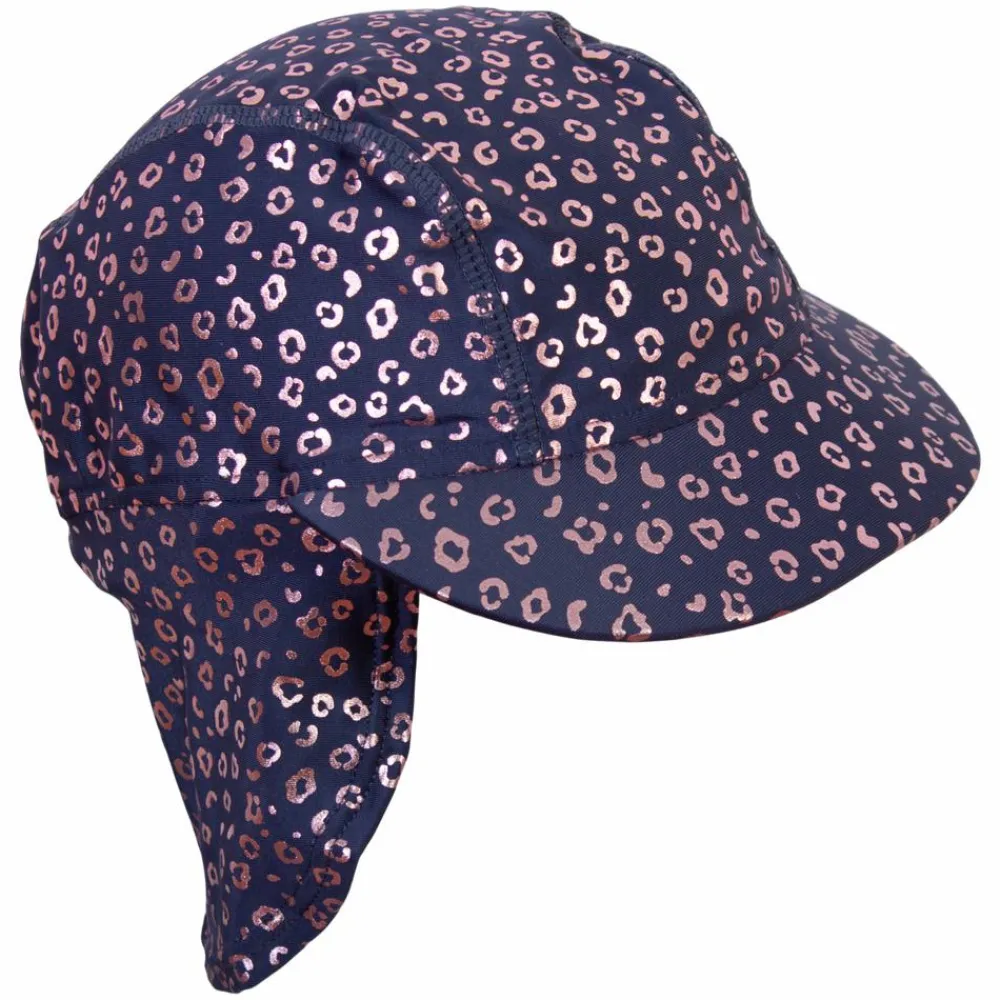Mikk-line baby badehat. Badehatten er tætvævet og giver god dækning. Hatten har en kasket foran og en lang nakke. Hatten er lavet i det samme fleksible og hurtigtørrende materiale som badebukserne.