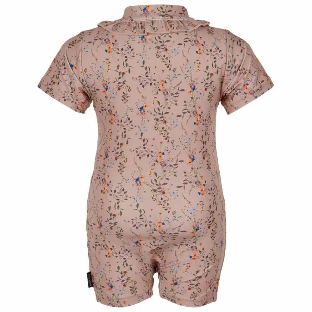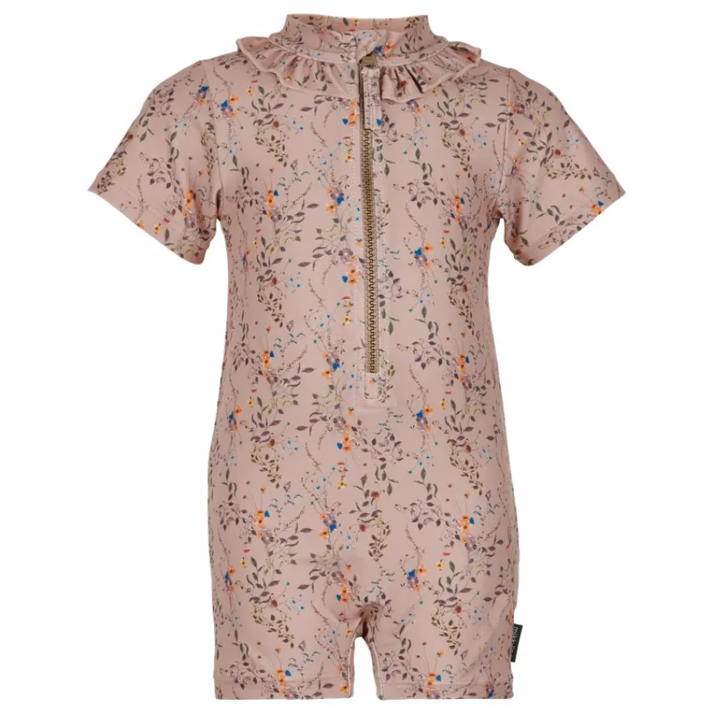 Mikk-Line pige pige UV heldragt UPF50+.UV heldragt med solbeskyttelse der beskytter mod solens skadelige UV-stråler. Badedragten har korte ærmer og ben og en høj hals med flæse detalje hele vejen rundt. Foran kan badedragten åbnes med en YKK lynlås i en brunlig/bronze farve der matcher badedragtens flotte farver. Badedragten er lavet i recycled materiale som er både lækkert og hurtigtørrende.