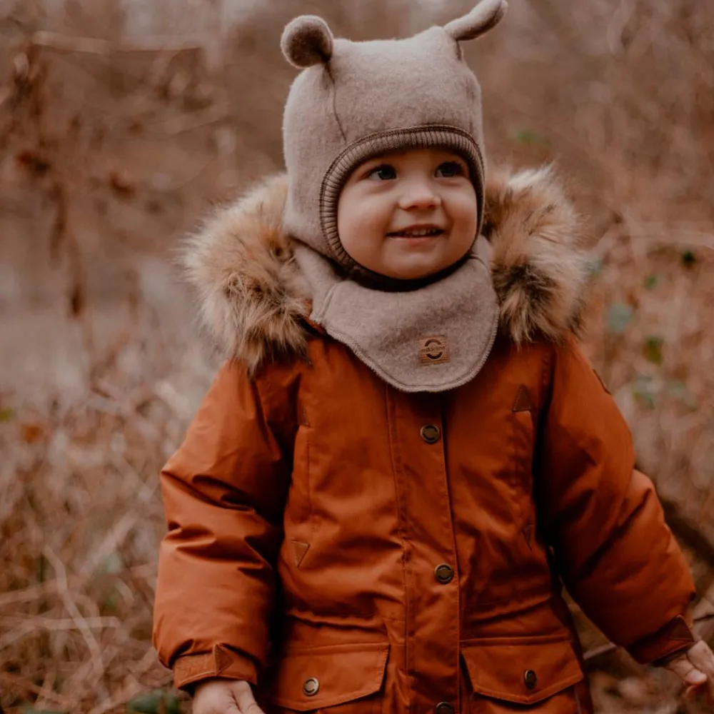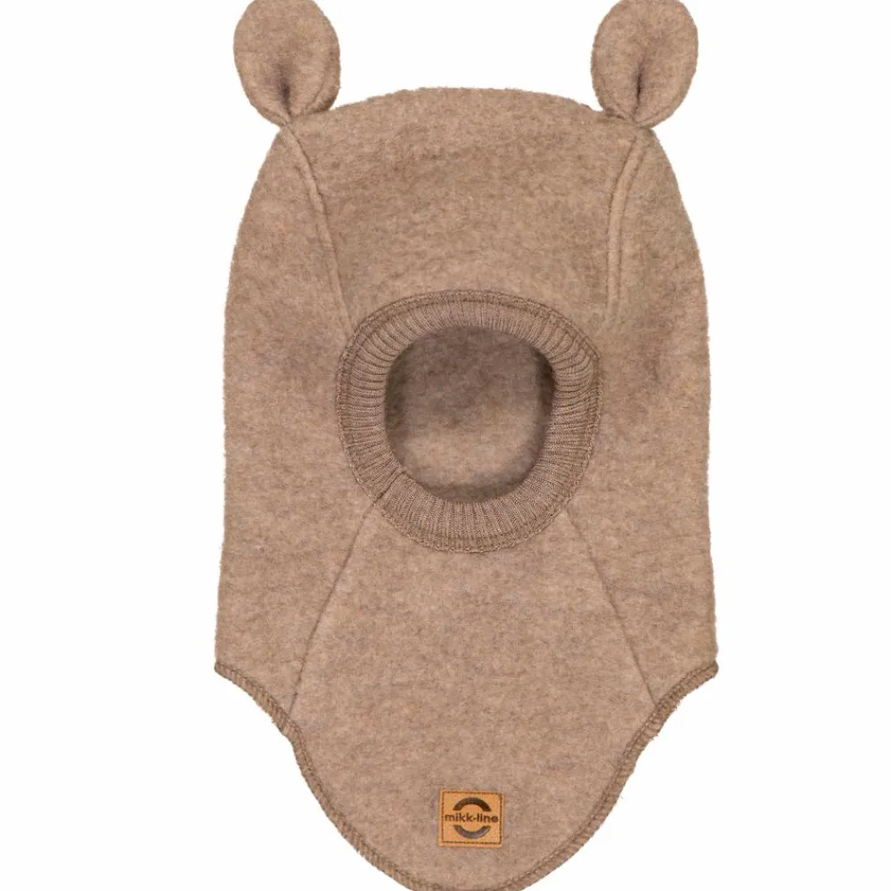 Mikk-line elefanthue i filtet uld. Elefanthuen har ører på toppen og en bred ribkant i ansigtsåbningen.