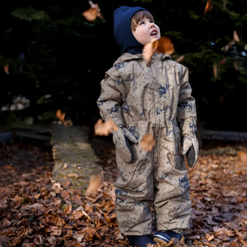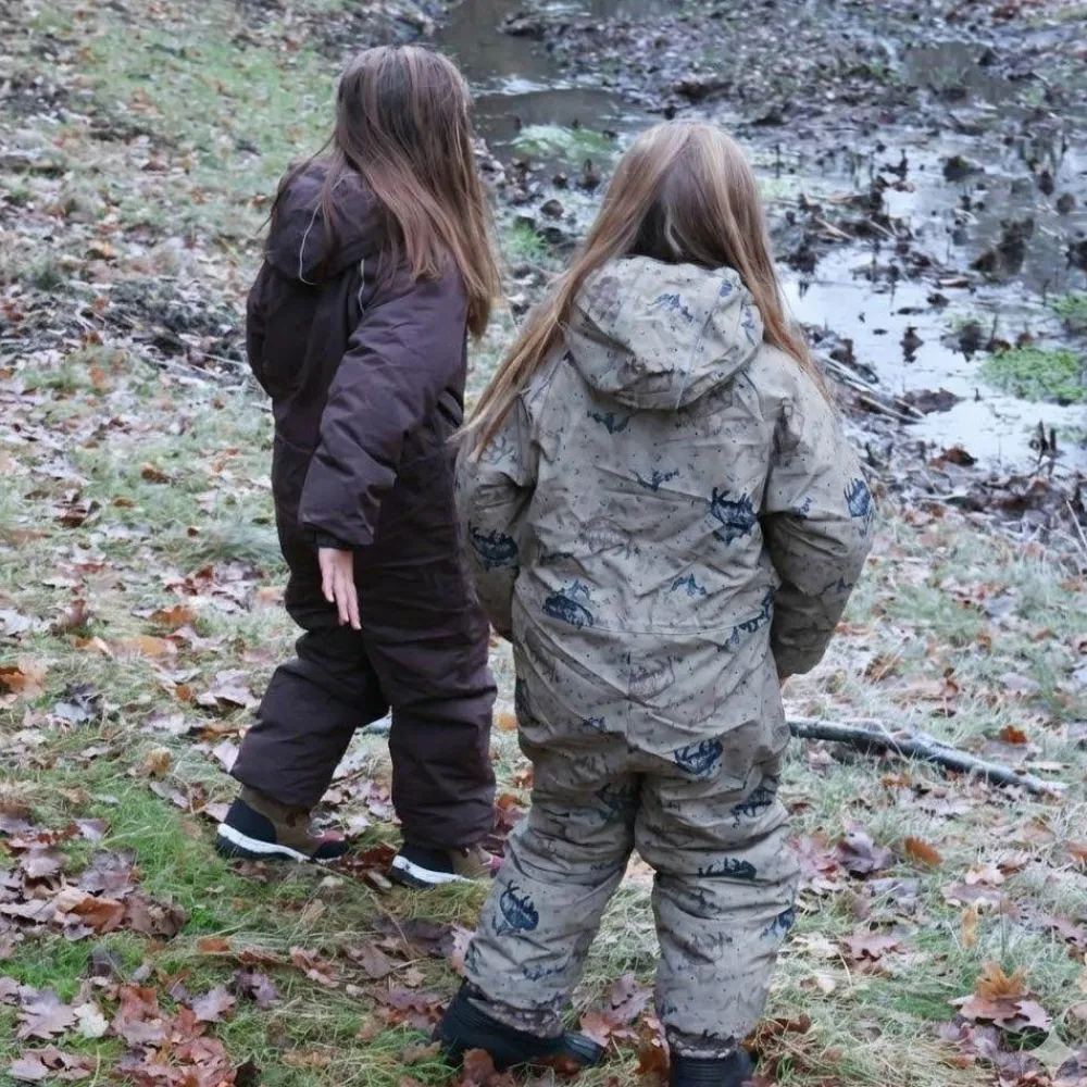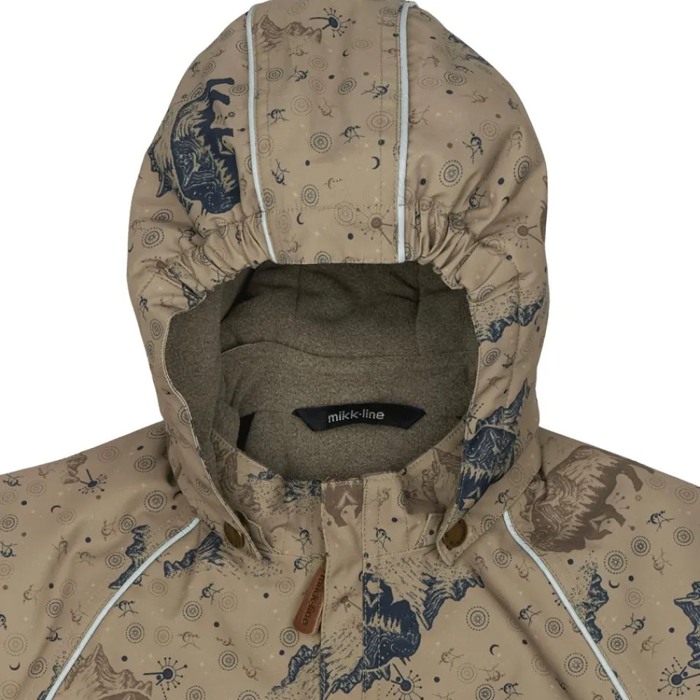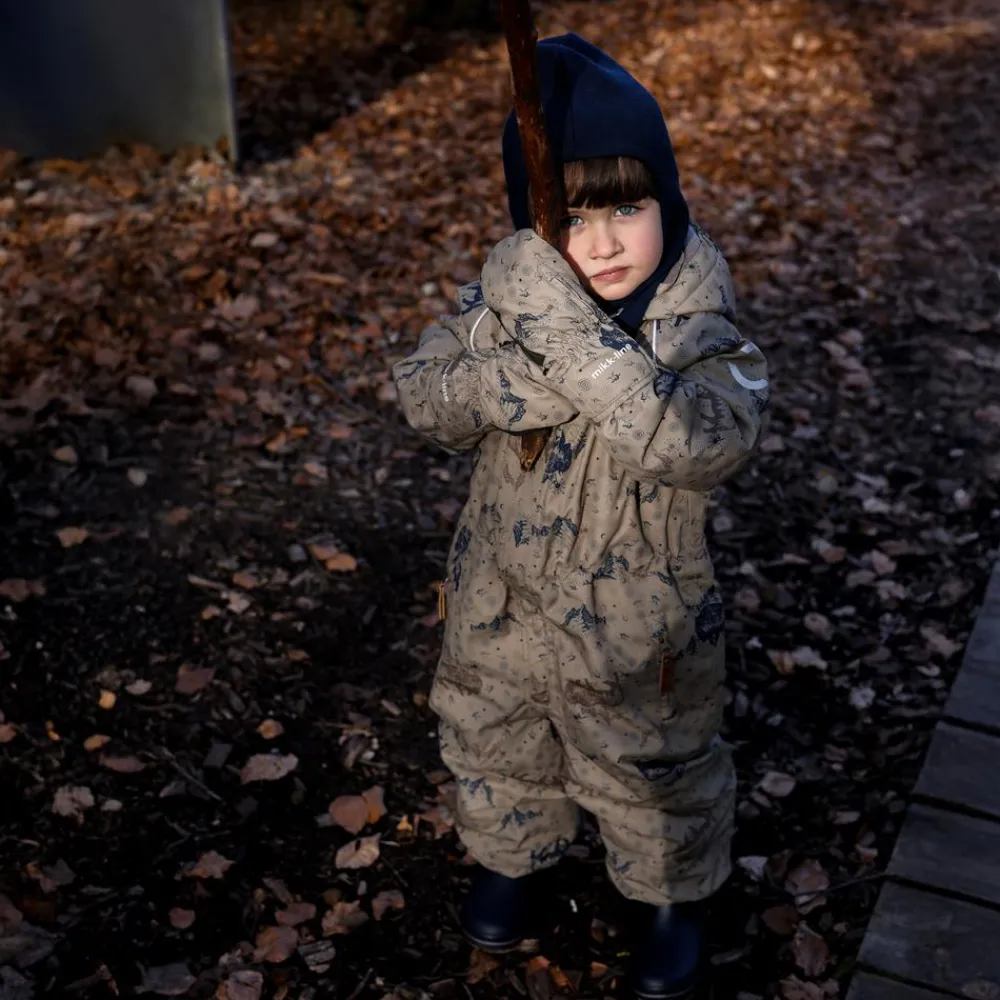 Mikk-line flyverdragt med et sejt all-over print. I denne lækre flyverdragt kan barnet lege og udforske naturen under den åbne himmel i alt slags vejr i løbet af de kolde og våde efterår- og vintermåneder. Yderstoffet på flyverdragten er lavet med 100% genanvendt polyester og polstret med polyesterfyld. Hætten og overkroppen har blødt fleece foer, hvorimod ærmerne og benene har en glat og gnidningsfri indvendig overflade. Dragten har en aftagelig hætte med trykknapper og justerbare og slidstærke silikone fodstropper under støvlerne.