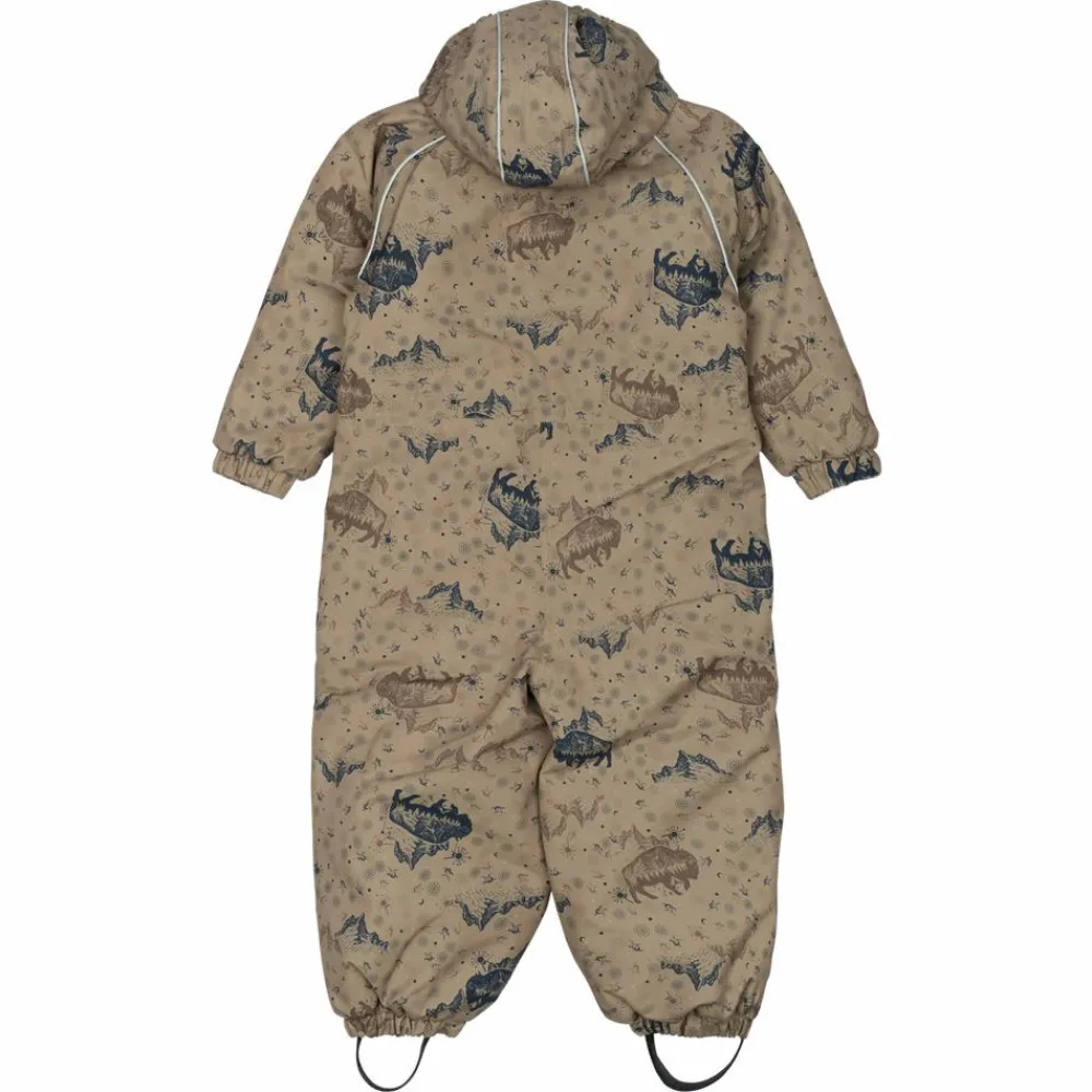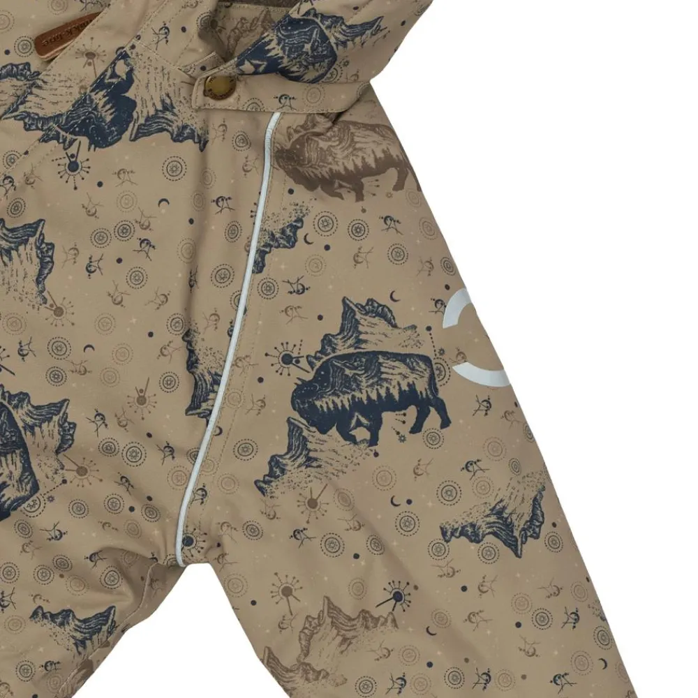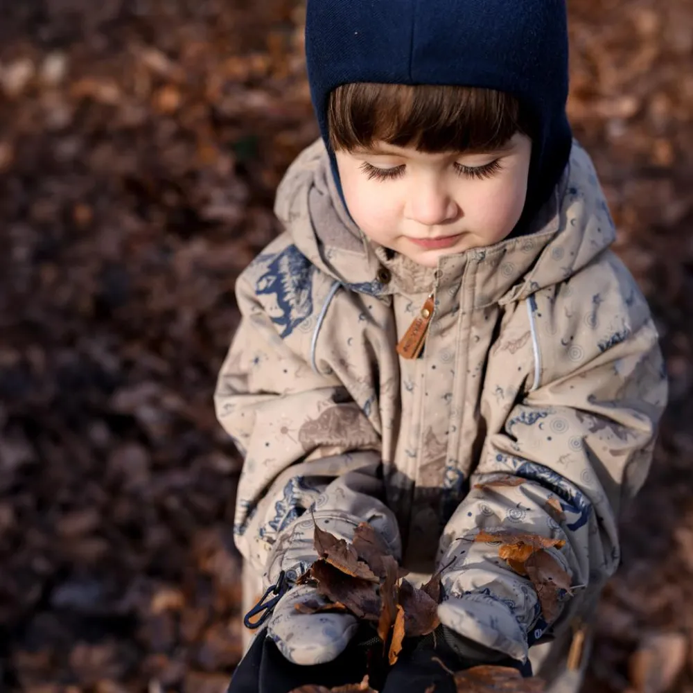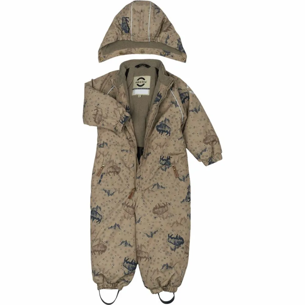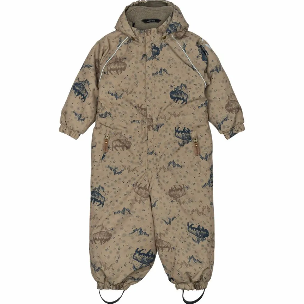 Mikk-line flyverdragt med et sejt all-over print. I denne lækre flyverdragt kan barnet lege og udforske naturen under den åbne himmel i alt slags vejr i løbet af de kolde og våde efterår- og vintermåneder. Yderstoffet på flyverdragten er lavet med 100% genanvendt polyester og polstret med polyesterfyld. Hætten og overkroppen har blødt fleece foer, hvorimod ærmerne og benene har en glat og gnidningsfri indvendig overflade. Dragten har en aftagelig hætte med trykknapper og justerbare og slidstærke silikone fodstropper under støvlerne.