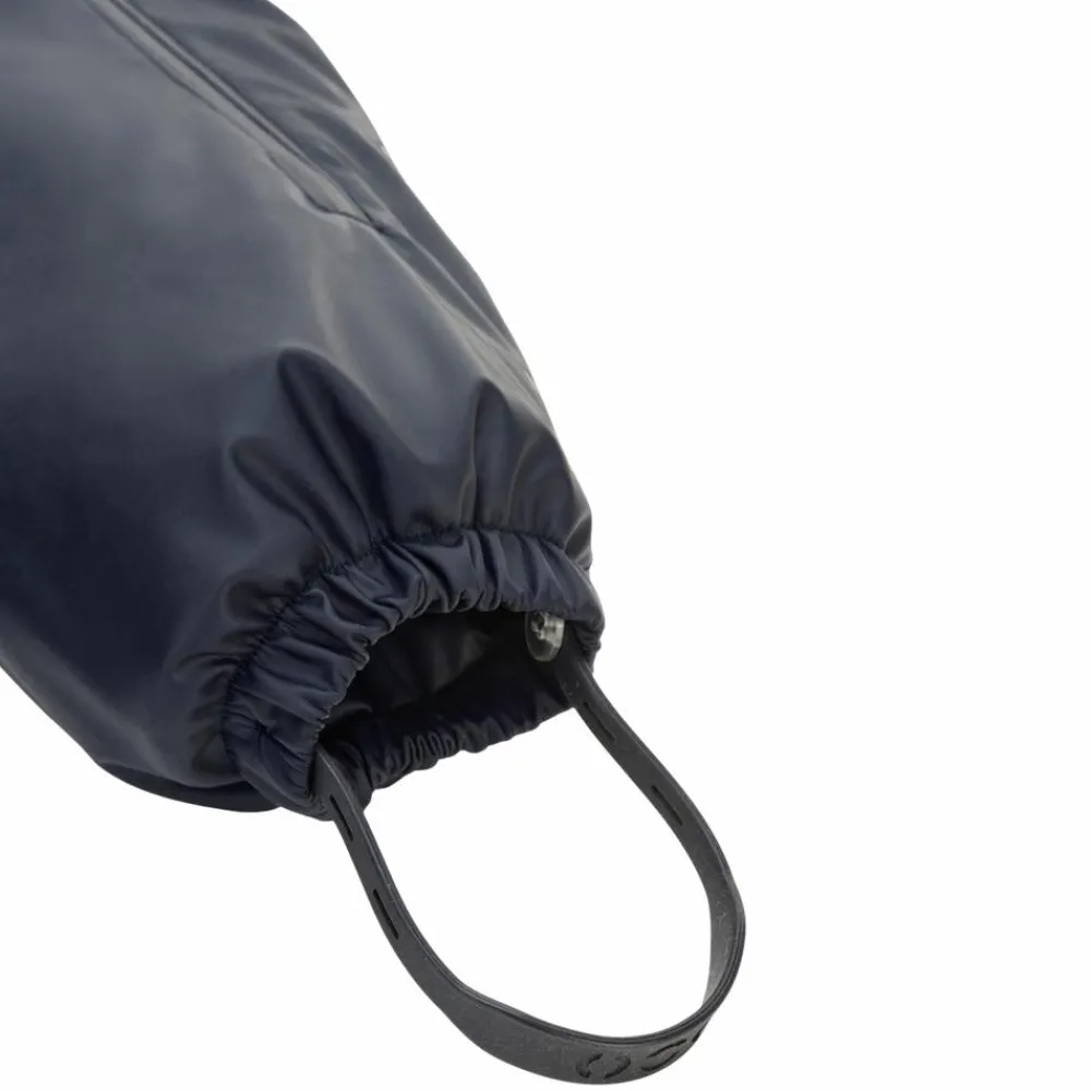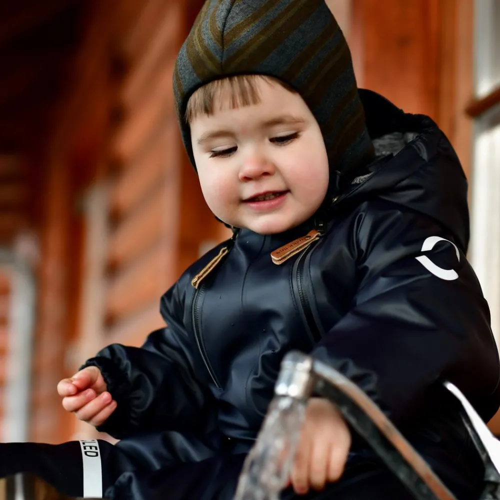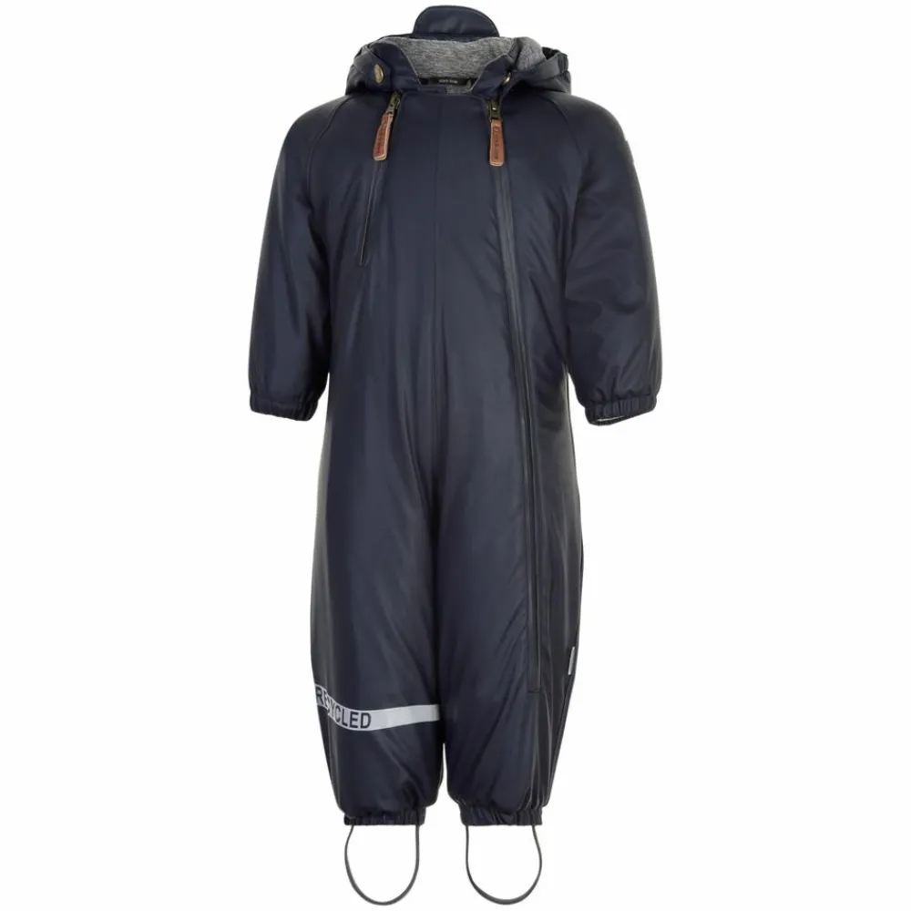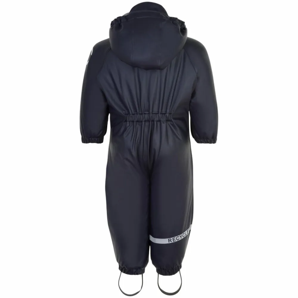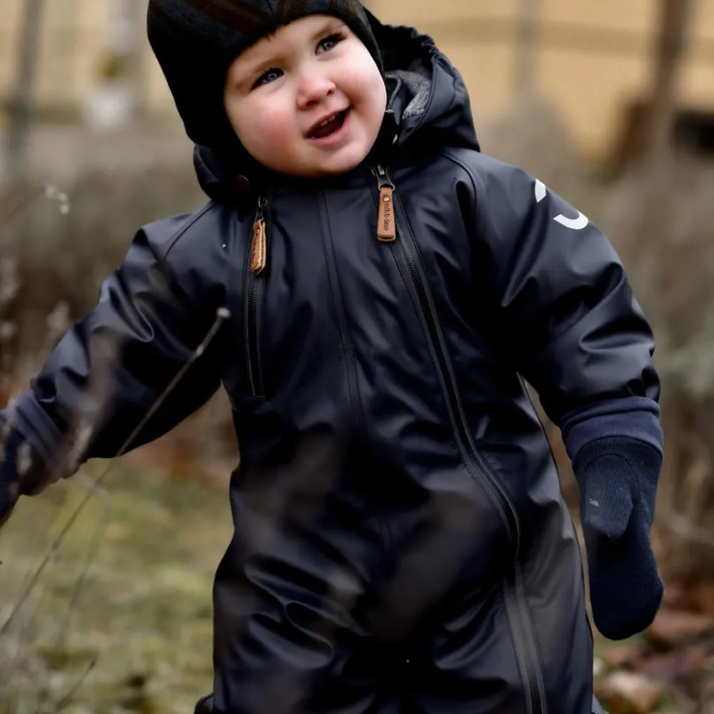Ensfarvet PU flyverdragt designet til at de mindste børn kan have det sjovt med at plaske i vandpytter, mudder og boltre sig i sneen. Det er en praktisk flyverdragt, der kan modstå både mudder, regn, vind og kulde. Flyverdragten er lavet af genanvendt PU og polstret med polyesterfyld. Overkroppen, hætten, kraven, og lommerne har blødt fleece foer, hvorimod ærmerne og benene har en glat og gnidningsfri indvendig overflade. Overfladen på flyverdragten er blød, fluorfri, vand- og smudsafvisende, så når legen er ovre, og dragten er dækket af mudder, kan du let rengøre den med en fugtig klud.