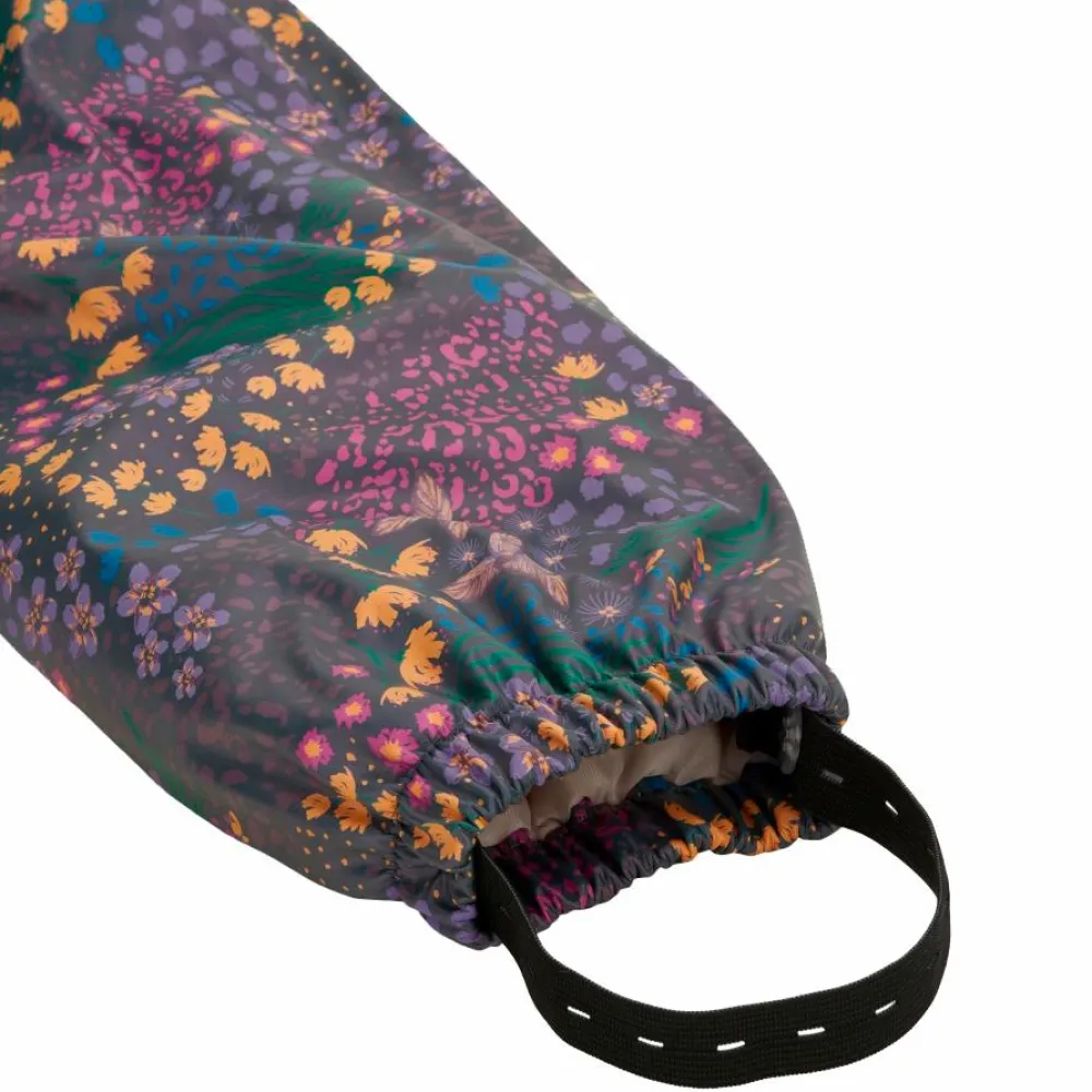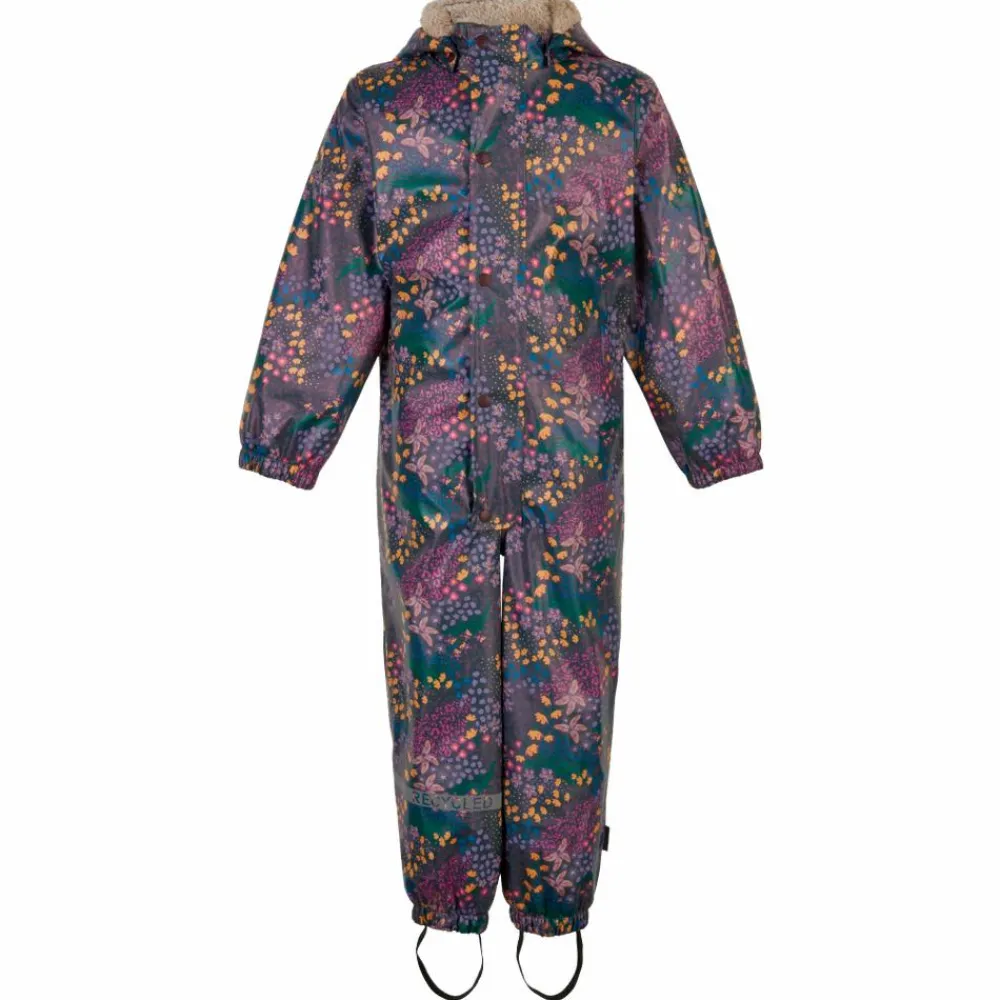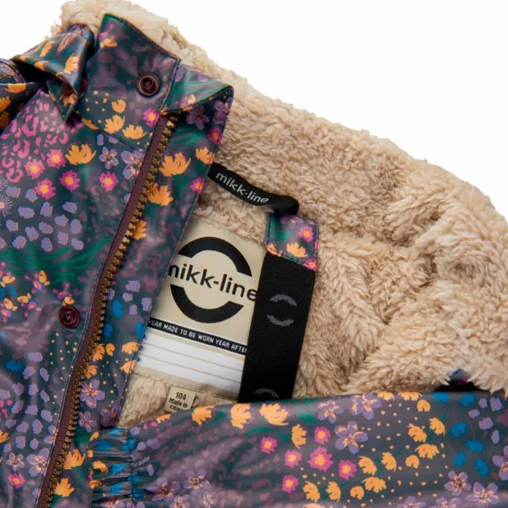 Mikk-Line PU regndragt med allover print, aftagelig hætte via trykknapper samt hætten med elastikkant i toppen. Dragten har elastik ved håndleddet og anklerne samt aftagelige og justerbare elastik fodstropper. Regndragten lynlåslukning med dobbelt vindstolpe, som lukkes med trykknapper på ydersiden. Regndragten er foret med blødt fleece.