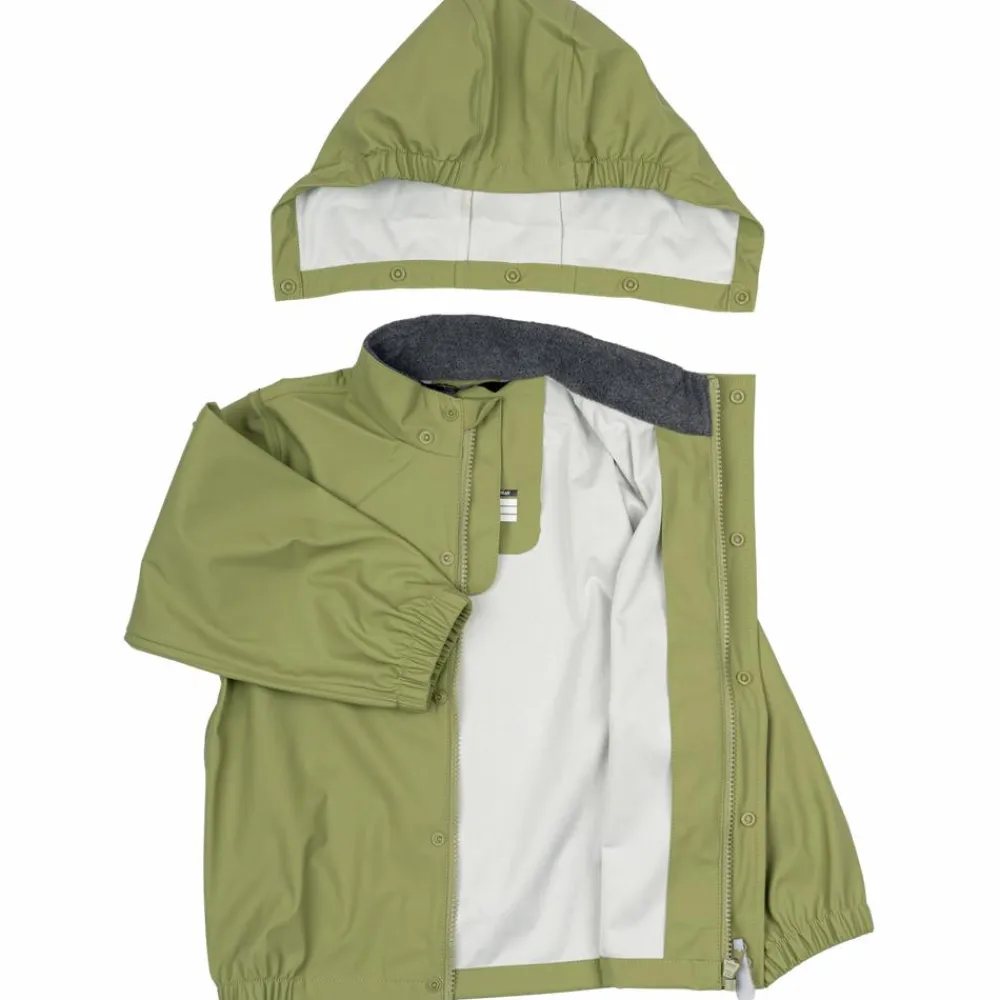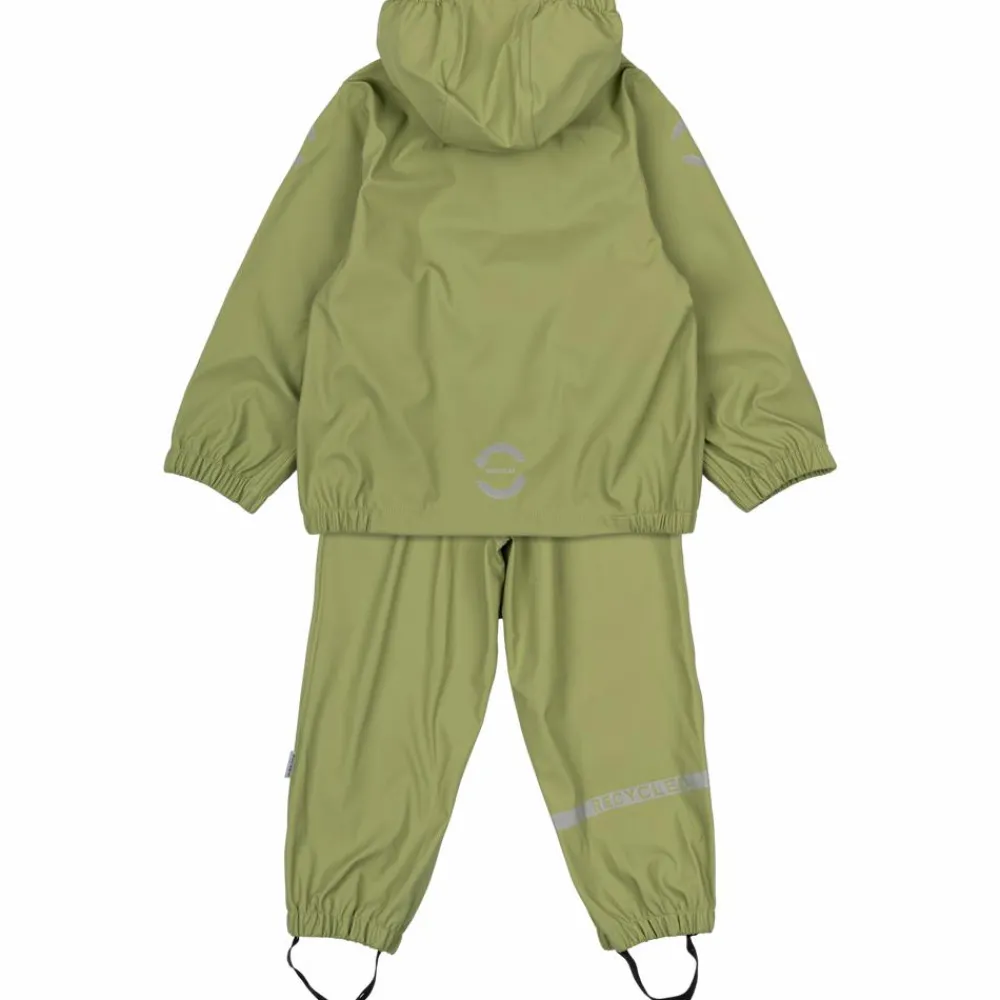 Mikk-line børne regntøjssæt. Sættet består af en regnjakke og et par regnbukser. Regnjakken har en aftagelig hætte, som sidder fast med trykknapper. Hætten har elastik i kanten, som gør at hætten sidder tæt til ansigtet. Halskraven er foret med blødt fleece. Regnjakken har elastik i ved håndleddene, samt elastik i bunden af jakken, som gør at bukserne tilpasser sig om håndleddene og om taljen. Jakken har lynlåslukning, med knappelukning udover, med en hagebeskytter. Regnbukserne har justerbar talje og elastik, som gør at bukserne tilpasser sig om livet. Ved anklerne er der justerbar elastikstropper som sættes under gummistøvlerne, elastikstropperne er aftagelige. Regnjakken og regnbukserne har begge 2 reflekser.