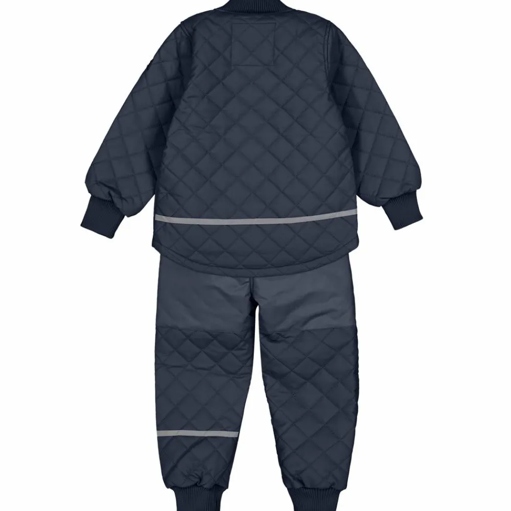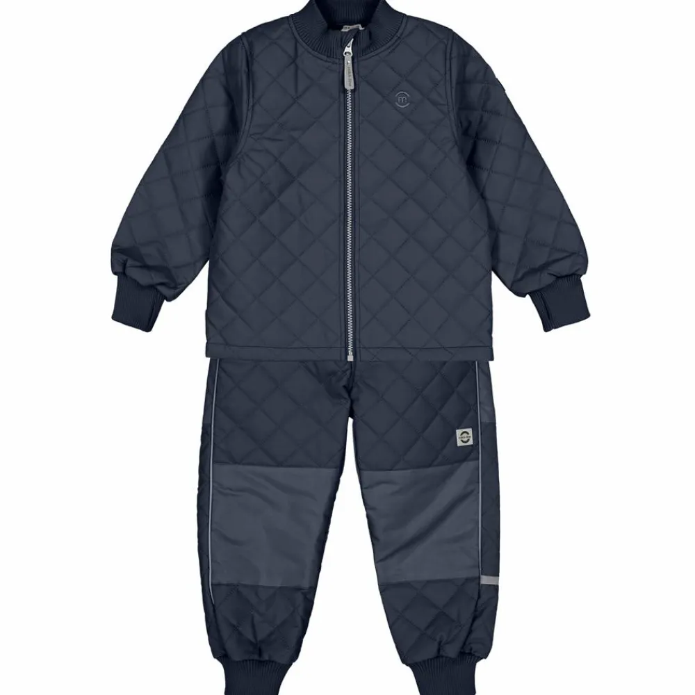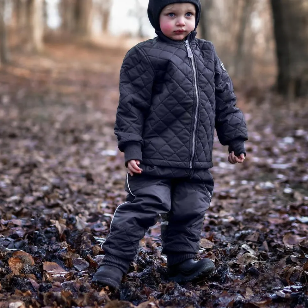 Mikk-line børne termotøj. Termosættet består af en termojakke med gennemgående lynlåslukning, bred rib ved halsen samt ved ærmerne. I ribkanten ved håndleddet er der det praktiske hul til tommelfingeren, som optimerer chancen for at holde kulden på afstand. Termobukserne har elastik samt regulerbar talje, forstærkning på knæ og bag samt bred ribkant ved anklerne. Dette smarte slidstærke termosæt til baby og børn har også refleksdetaljer. Hovedstoffet på både overdel og underdel er vandtæt.