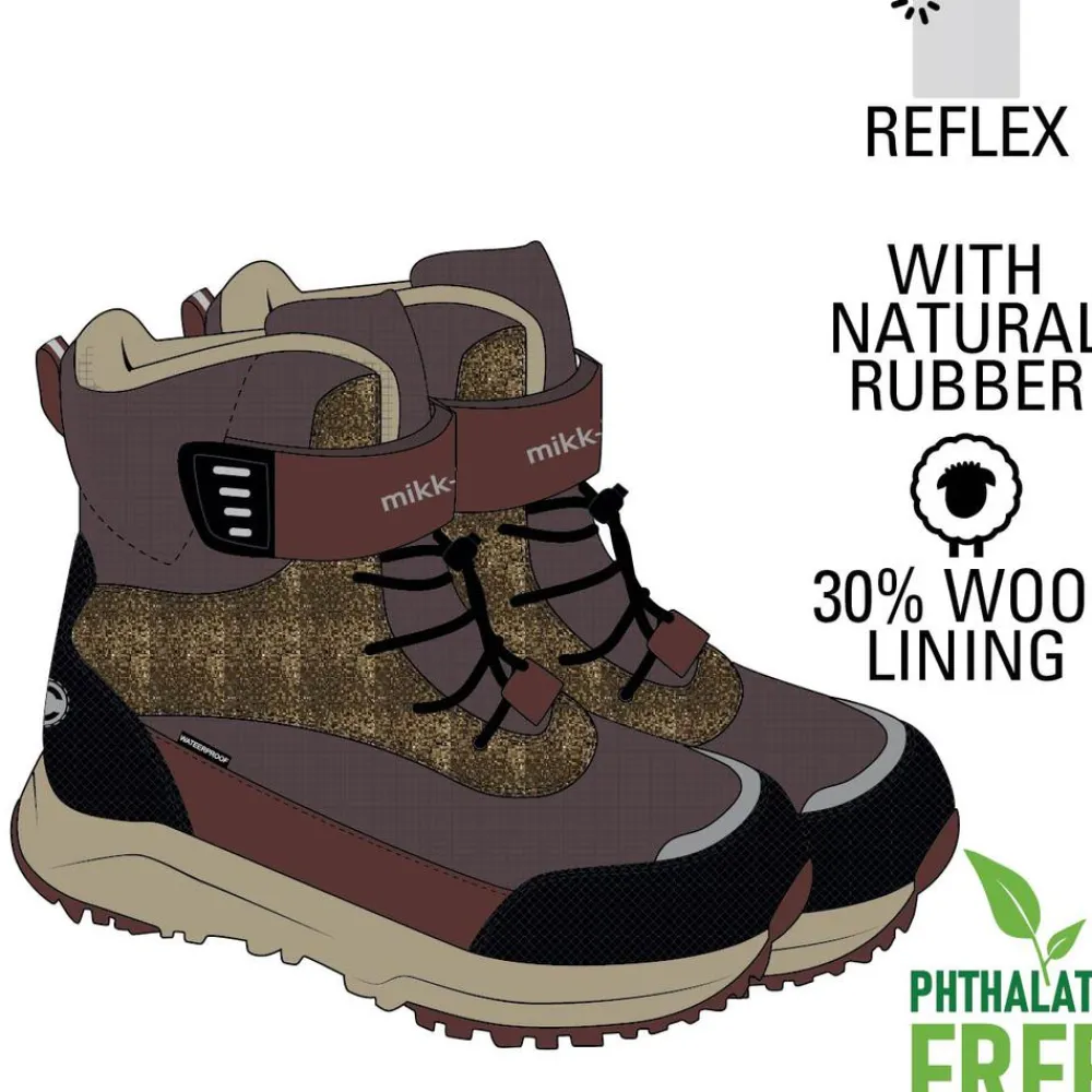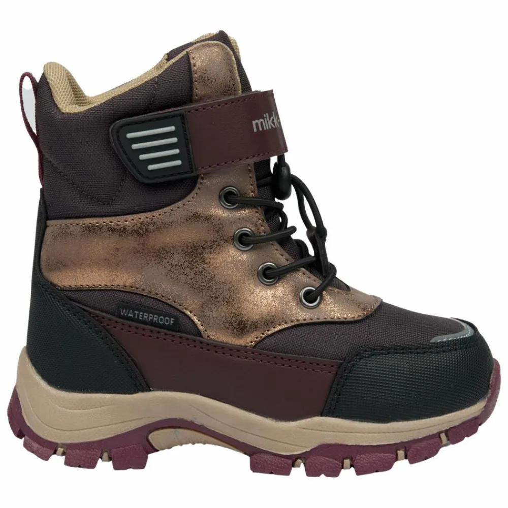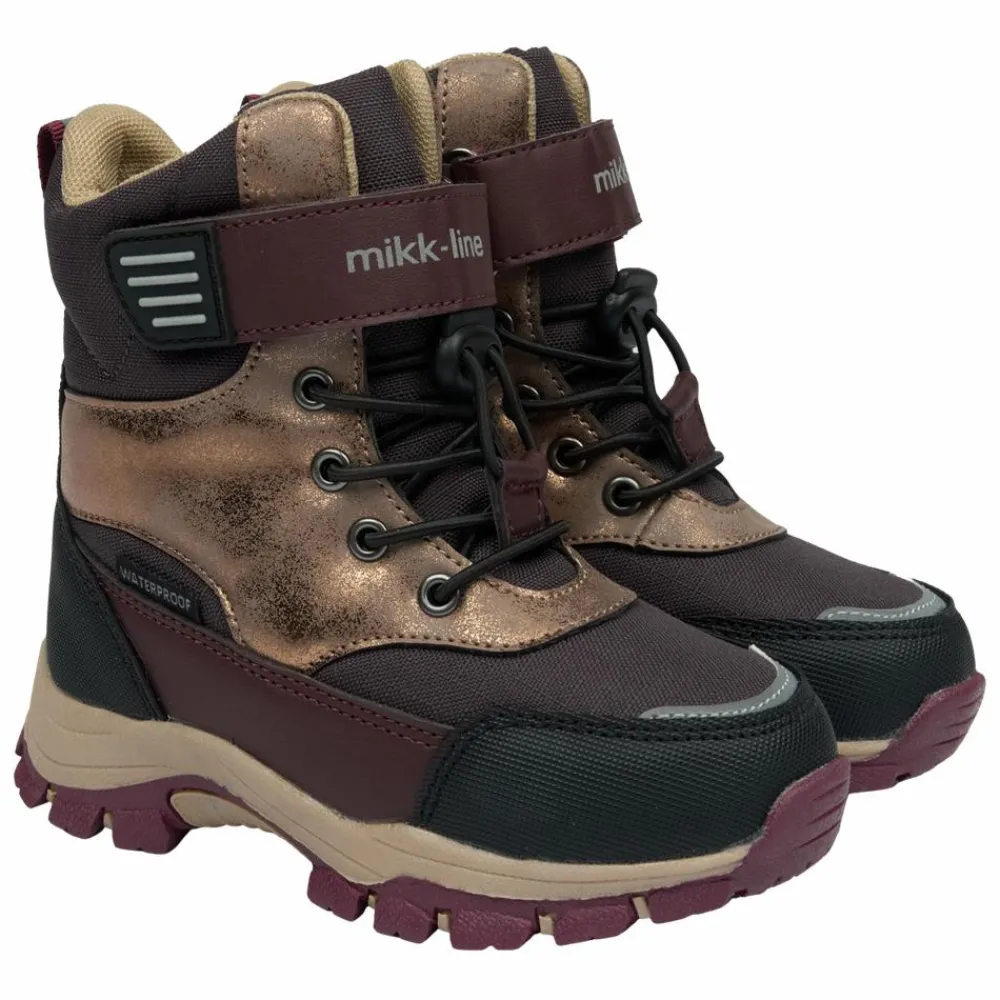 Mikk-line vinterstøvler til pige. En vandtæt støvle, der med en isolerende foring sørger for at holde fødderne varme og tørre i de kolde vintermåneder. Støvlerne har velcrolukning og justerbare snøre. De har en strop bagtil, så de er nemme for barnet at få af og på. Ydersålen er robust og har et groft mønster, der giver et godt fodfæste på glatte overflader.
