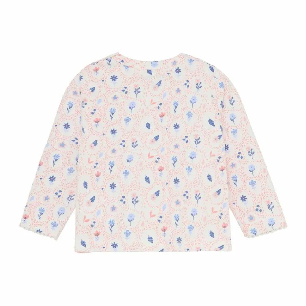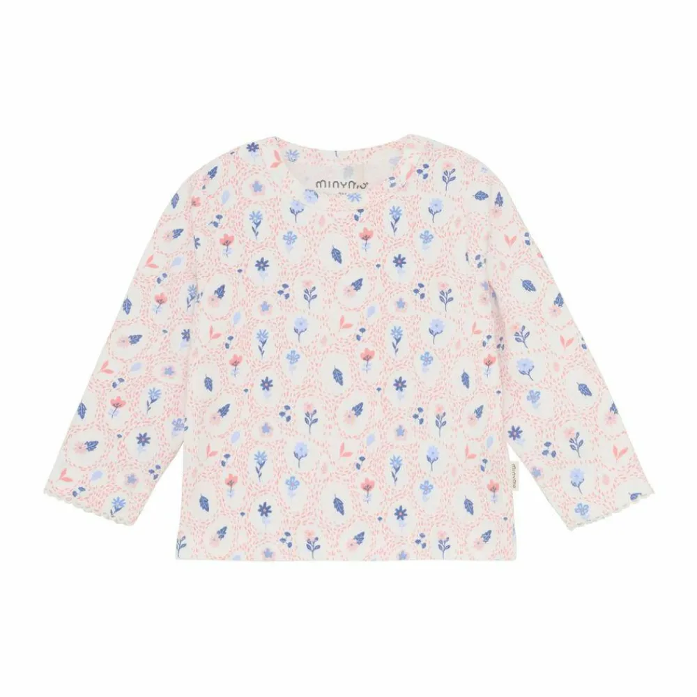 Fin langærmet t-shirt med allover print fra Minymo. T-shirten er lavet i en blød bomuldsblanding, som føles behagelig på huden. T-shirten har et flot blomsterprint og fine hæklede detaljer ved håndleddene. Lukkes med skjulte trykknapper på skulderen