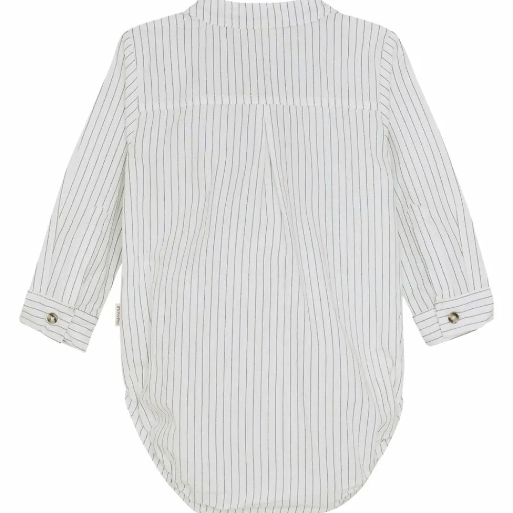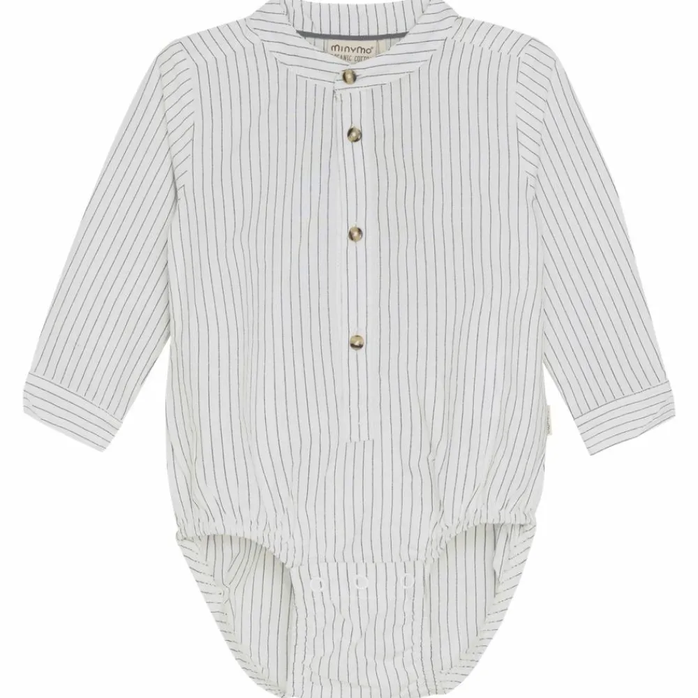 Minymo langærmet body i bomuldskvalitet. Bodyen har stribet mønster, og knapper på fronten og i ærmer. Bodyen har skjult knaplukning i bunden.