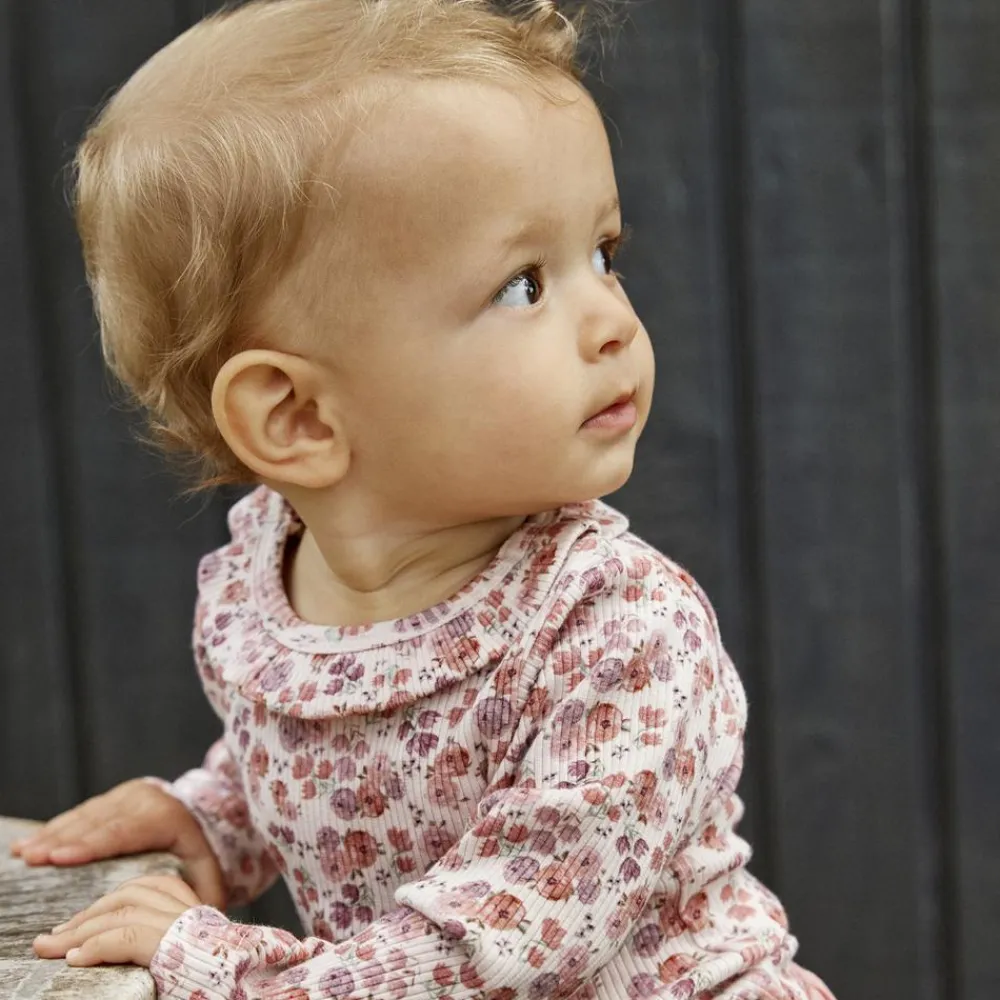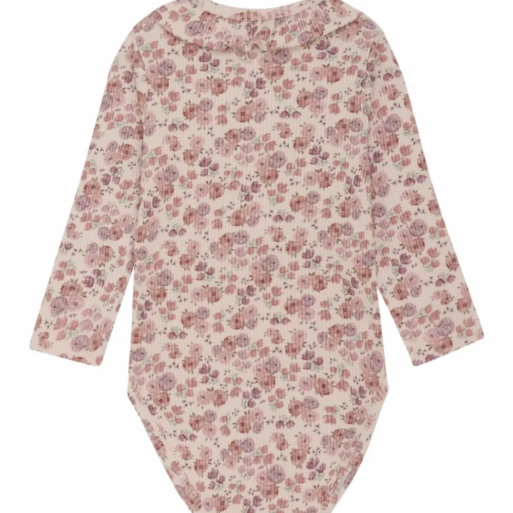 Minymo langærmet body med all-over print. Bodyen har flæser langs halsåbningen. Bodyen har skjult knaplukning i bunden og på skulderen.