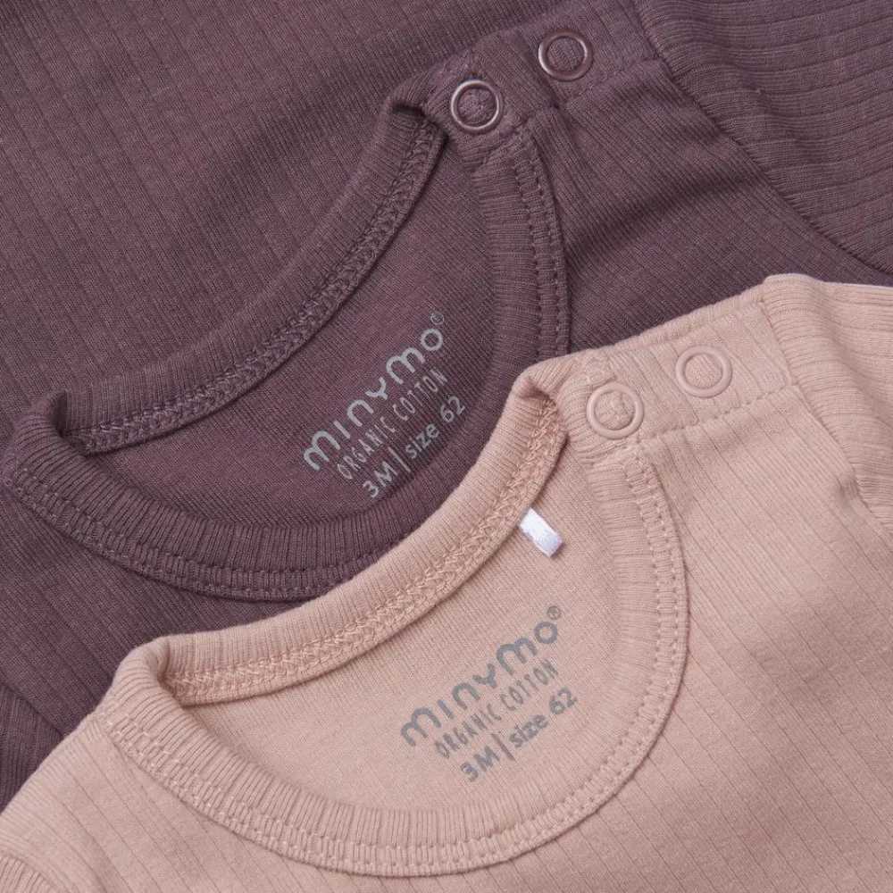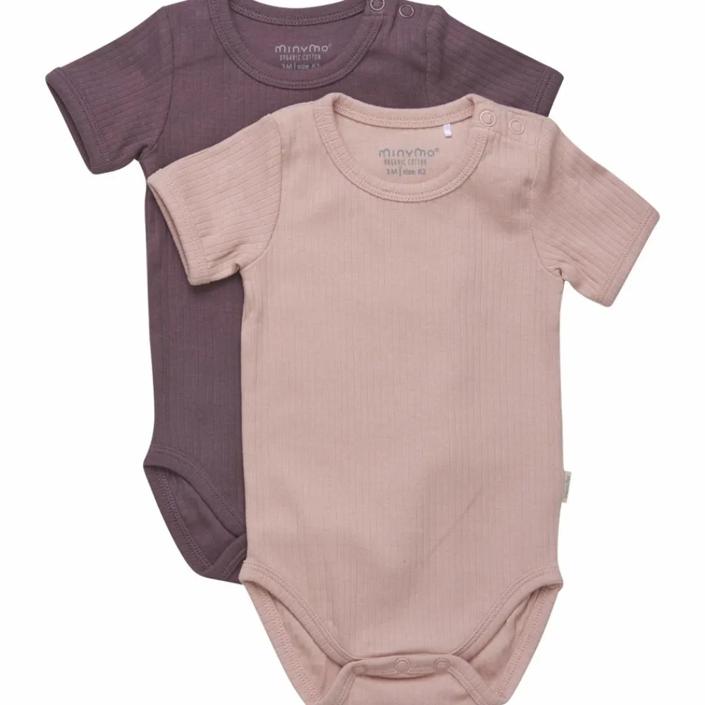 Minymo 2-pack kortærmede baby bodystockings til de små. Denne bodystocking har to trykknapper ved halsåbningen for nem af – og påklædning, samt 3 trykknapper ved skridtet, så det er let at skifte ble.