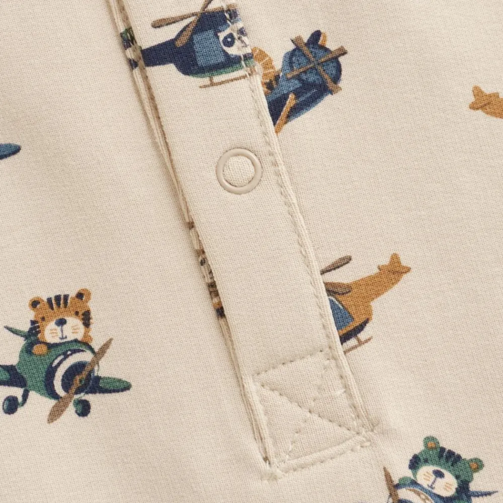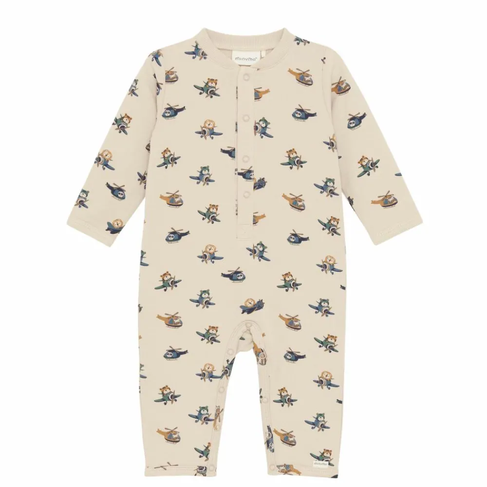 Minimo baby dragt med sødt all-over print af små helikoptere. Heldragten er lavet i et blødt materiale, der er behageligt at have på og giver en god bevægelighed.