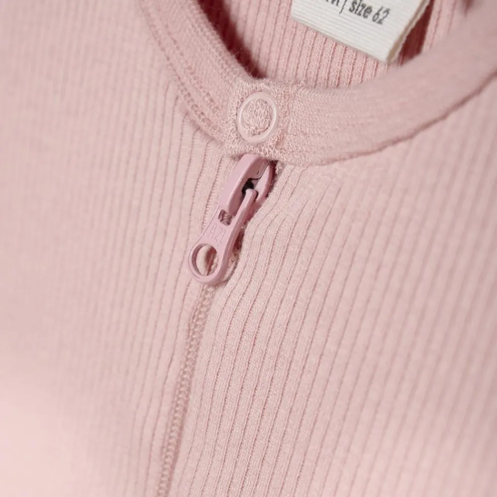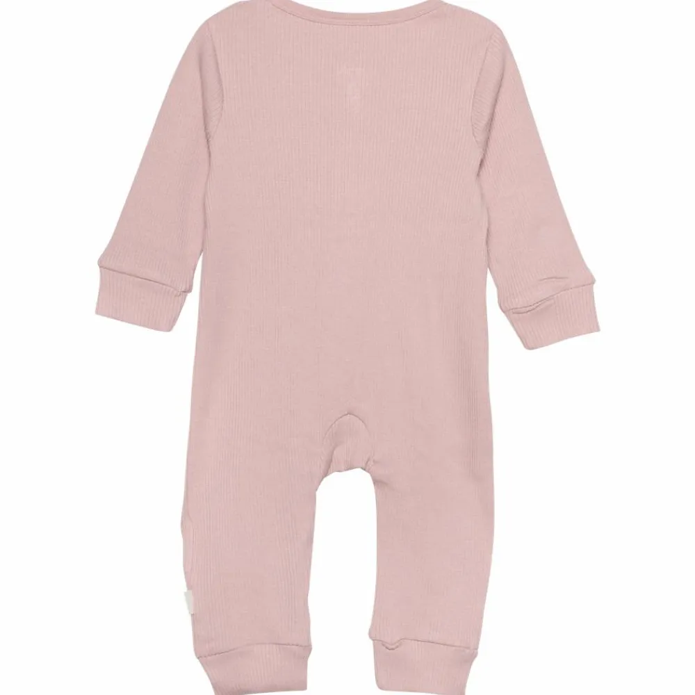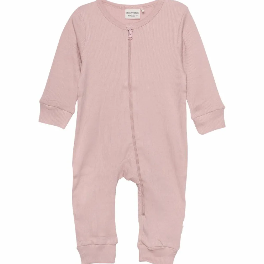 Minymo baby heldragt i rib materiale. Heldragten er i strækbart materiale og har en ribkant langs alle åbninger.