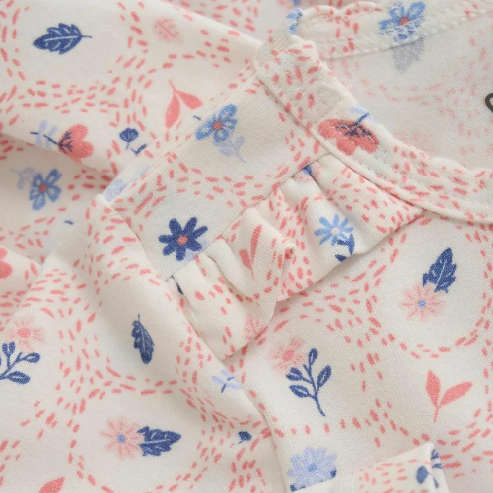 Fin langærmet bodykjole med allover print fra Minymo. Bodykjolen er lavet i en blød bomuldsblanding og har et flot blomsterprint samt fine flæsedetaljer på skulderen. Bodykjolen lukkes med skjulte trykknapper på skulderen og trykknapper mellem benene