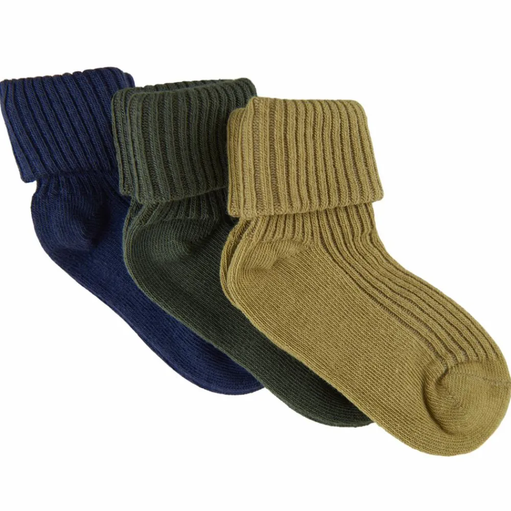 Minymo baby strømper med ribkant 3-pak. Super lækre og fine strømper som kan foldes op og ned. Ovenpå strømpen samt fra anklen og op er strømperne ribstrikket. Strømperne kommer i tre forskellige farver som vist på billedet.