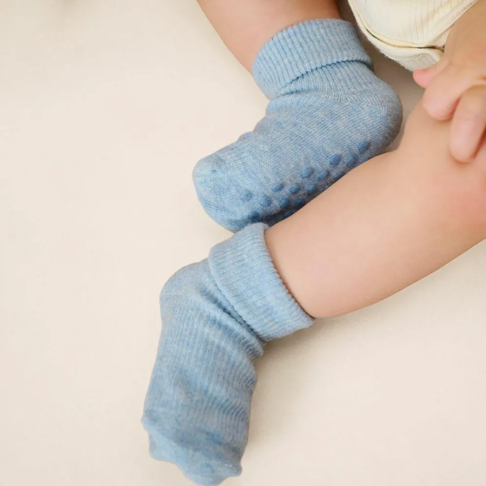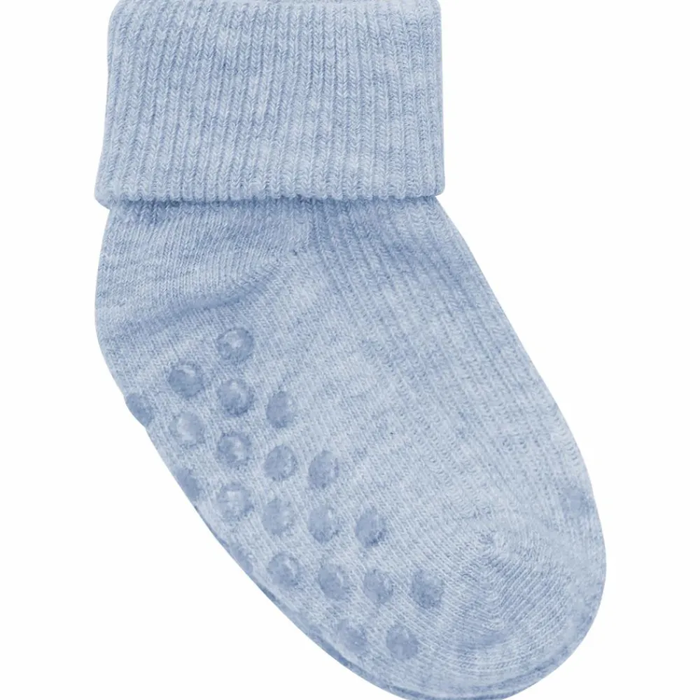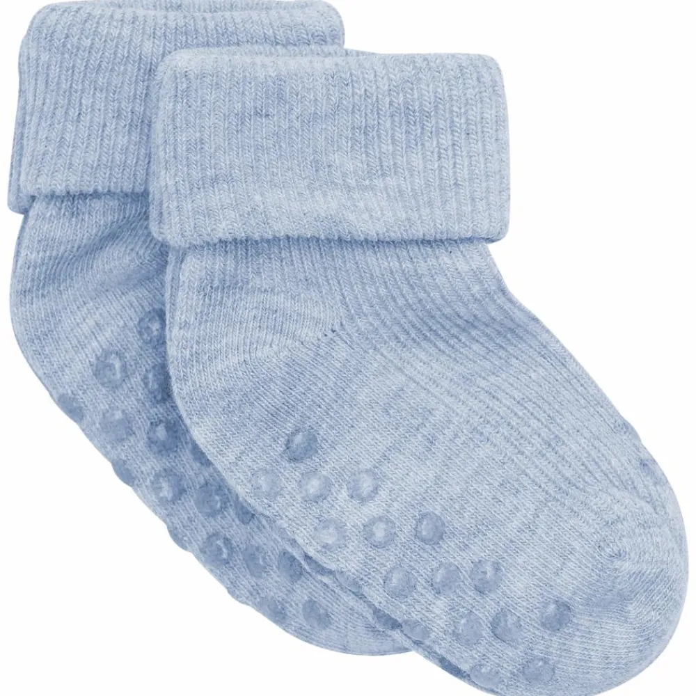 Minymo 2-pak med skridsikre strømper til de mindste. Strømperne har skridsikker bund samt gummi dutter på oversiden af foden, som gør det nemmere for barnet at stå fast, når det skal lære at kravle og gå.