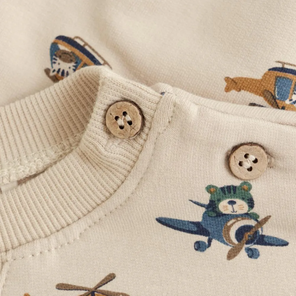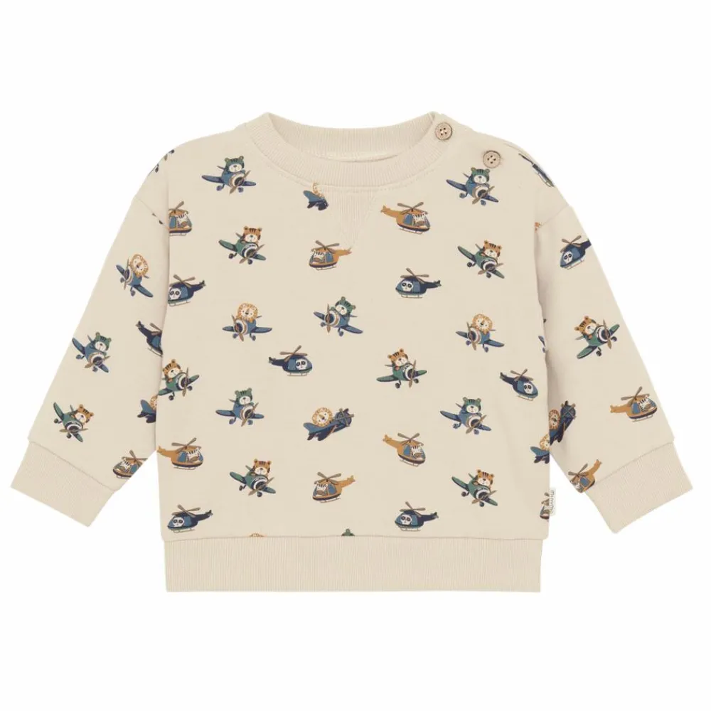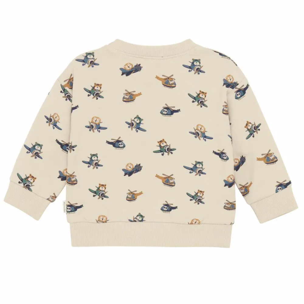 Minymo baby sweatshirt med et sødt all-over print af små helikoptere. Sweatshirten er lavet i et blødt materiale, med en rund halsudskæring i rib og lukkes med 2 knapper ved skulderen.