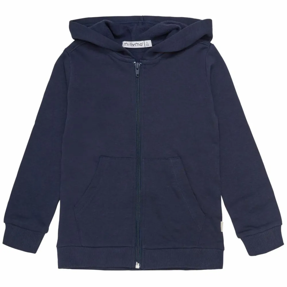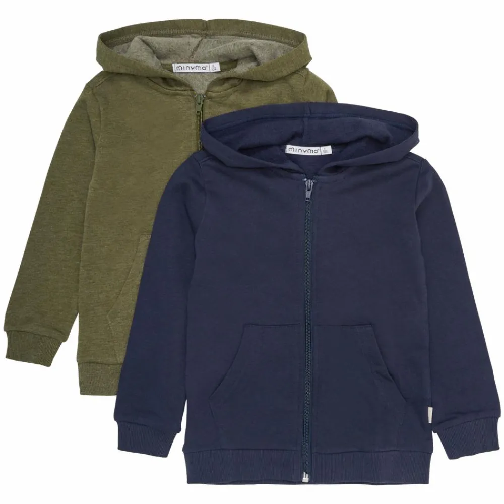 Minymo hættetrøje m. lynlås 2-pak. Flot sweatshirt med hætte, lynlåslukning samt ribkant ved hofte og ærmegab. Den flotte sweat cardigan har to lommer foran og trøjen har et dejligt blødt indvendigt bomuldsfor.