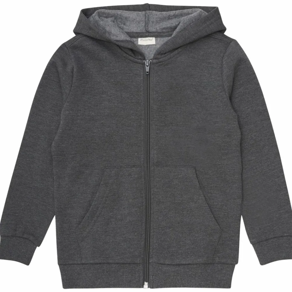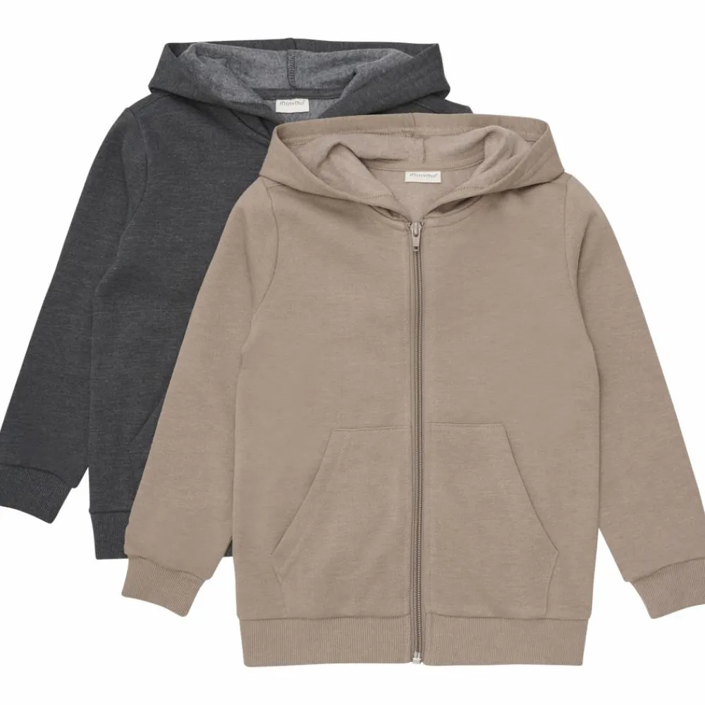 Minymo hættetrøje m. lynlås 2-pak. Flot sweatshirt med hætte, lynlåslukning samt ribkant ved hofte og ærmegab. Den flotte sweat cardigan har to lommer foran og trøjen har et dejligt blødt indvendigt bomuldsfor.
