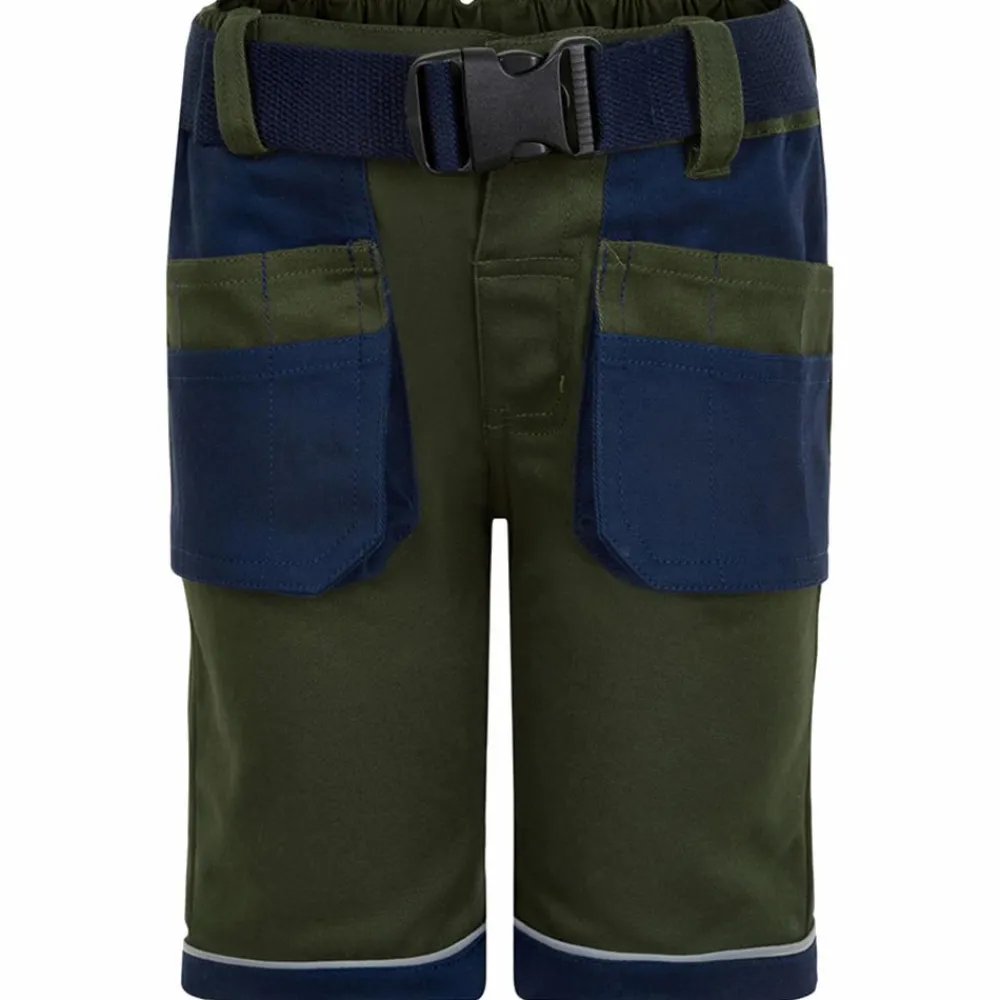 Minymo børne arbejdsshorts med reflekser om lårene. Shortsene har lommer foran og bagpå, samt spænde om taljen. Bukserne lukkes med lynlås og trykknapper. Bukserne er slidstærke og strækbare.
