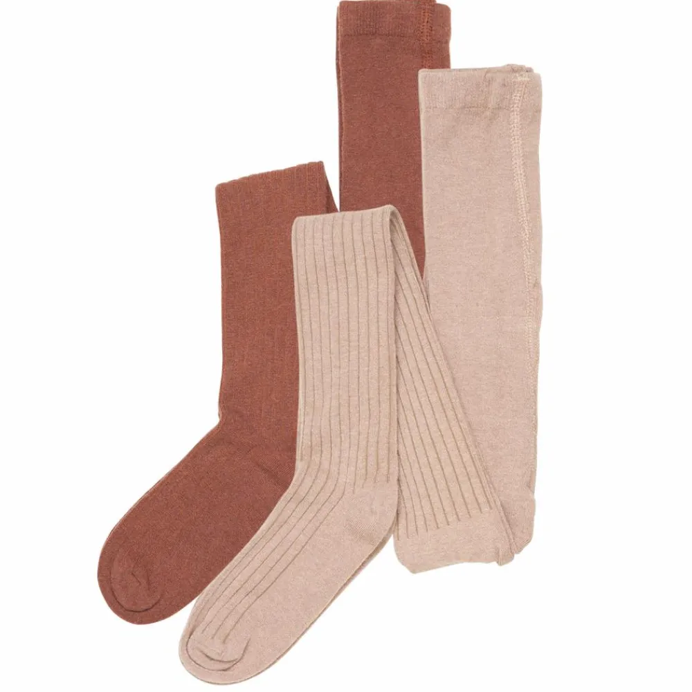 Strømpebukser i ribstrikket look af bl.a. uld og viskose. Der er ingen syning over tæerne, også kaldet “soft toe”. I taljen er der elastikkant til at holde dem på plads. Pakken består af to par strømpebukser og er perfekte til de køligere dage, hvor ulden er med til at holde de små ben varme.
