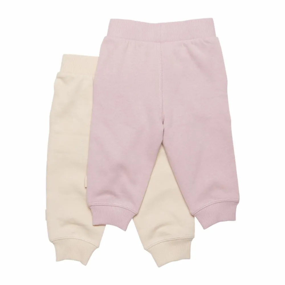 Minymo baby sweatpants 2-pak. Virkelig lækre bukser til baby med blød børstet inderside og elastisk ribkant i taljen. Bukserne har to skrå lommer, en i hver side. I buksebenene er der ribkant til at lukke tæt om anklerne. Bukserne er ensfarvet.