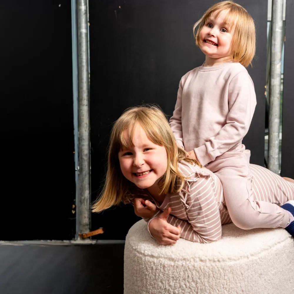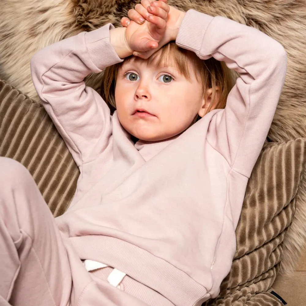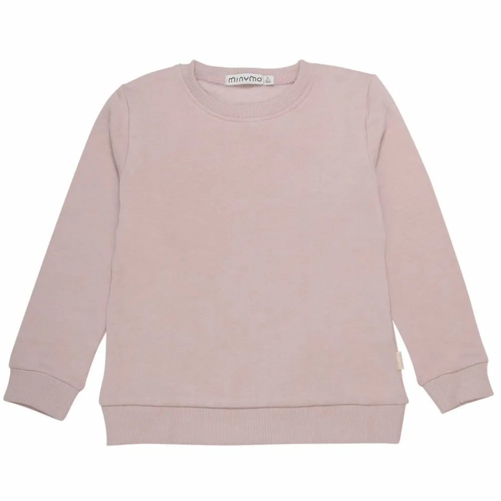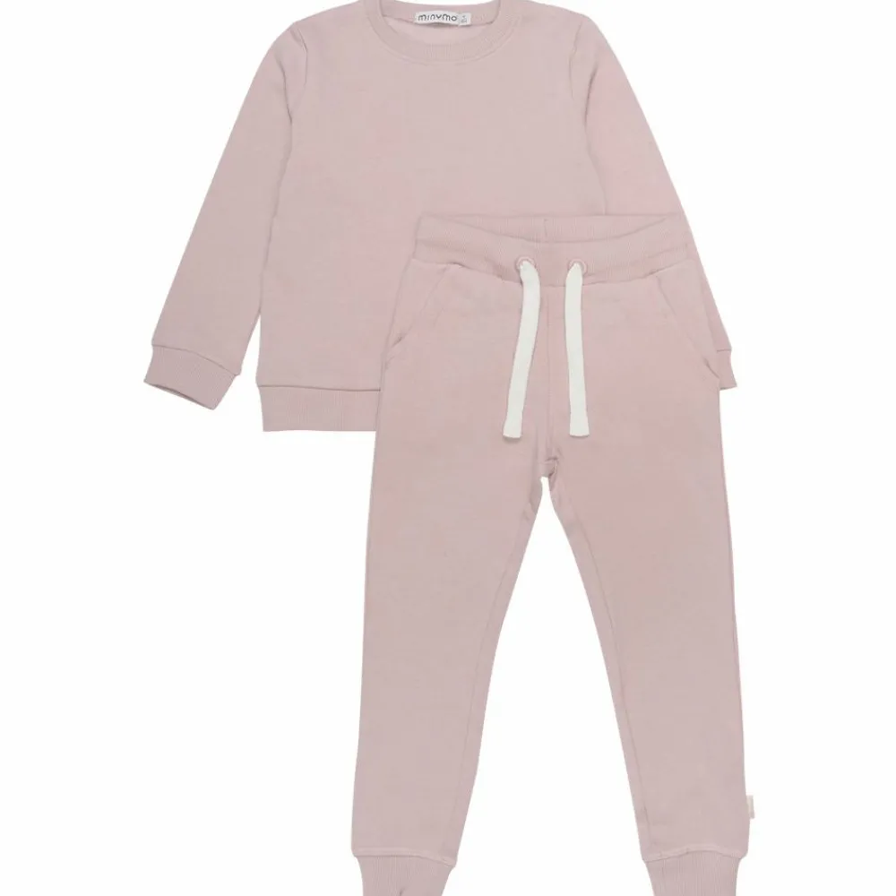 Minymo børne sweatsæt. Lækkert sweatsæt bestående af en langærmet bluse og bukser med blød børstet inderside. Sweatshirten har rund halsudskæring samt ribkant ved hals, hofte og ærmegab. Bukserne har elastik og bindebånd i taljen, to lommer samt ribkant ved talje og ankler.