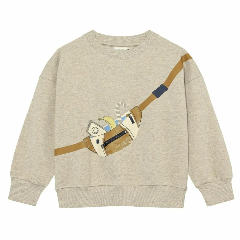 En blød, rundhalset trøje i beige meleret, der føles rar mod huden og giver plads til bevægelse. Det sjove frontmotiv med bæltetaske og små detaljer giver hverdagens leg et ekstra glimt i øjet, mens ribkanter ved ærmer og forneden holder pasformen på plads.