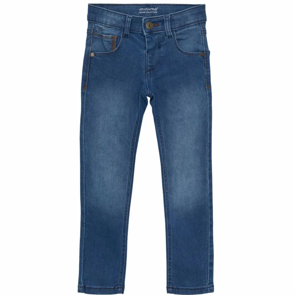 Minymo drenge jeans slim fit. Super lækre jeans med en masse stretch. Bukserne har bæltestropper, fem lommer og knap- og lynlåslukning. På indersiden kan bukserne justeres i taljen med elastik og knap. Bukserne er slim fit, hvilket vil sige, at de er tætsiddende.