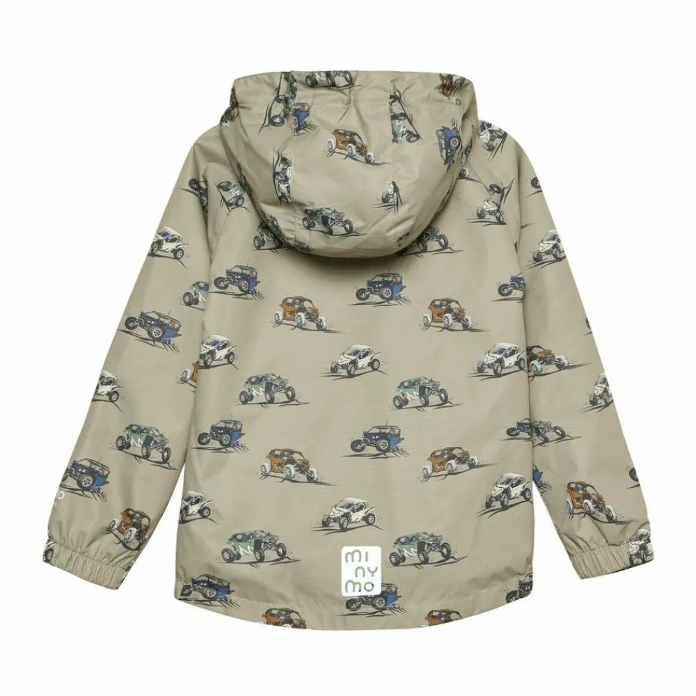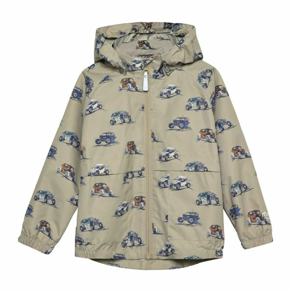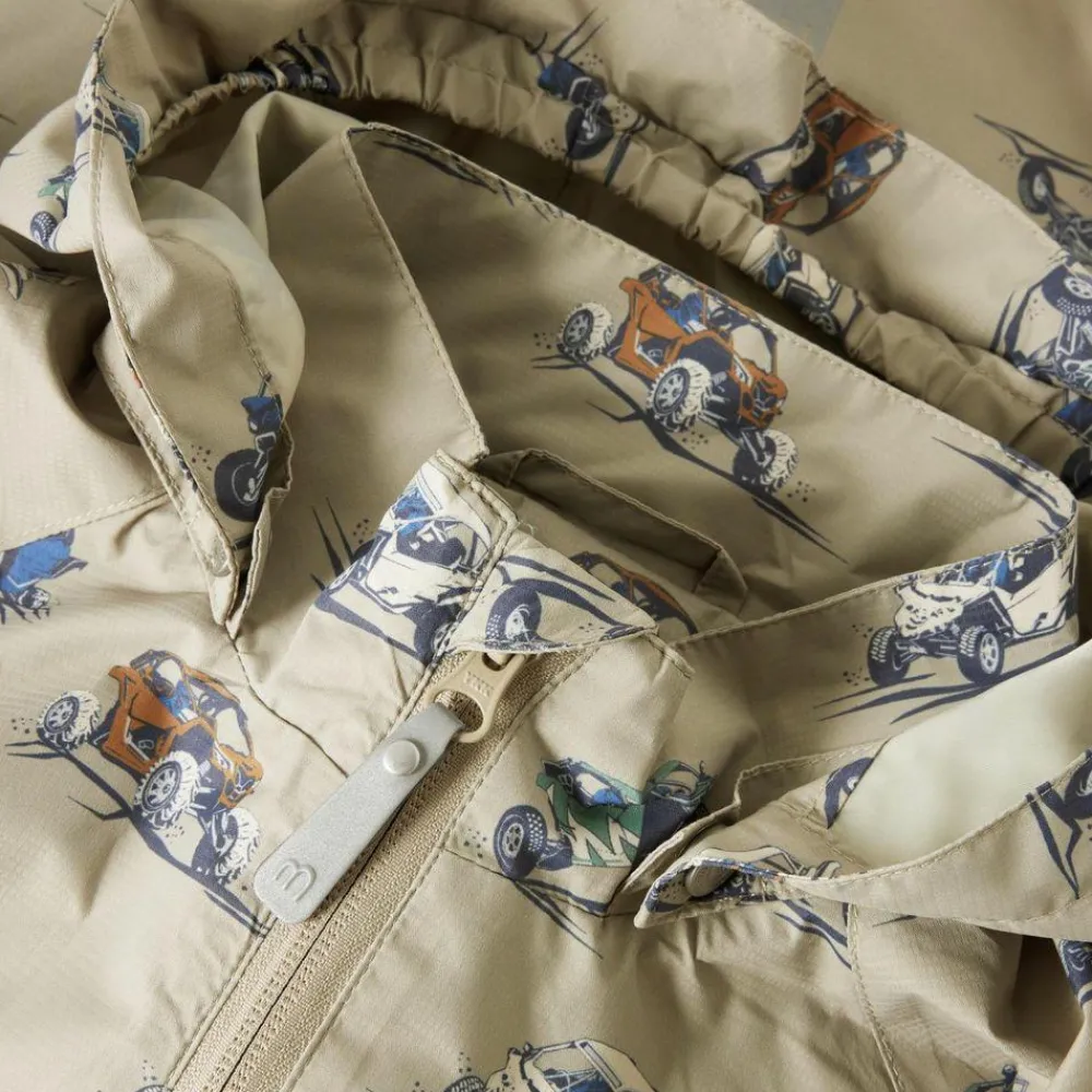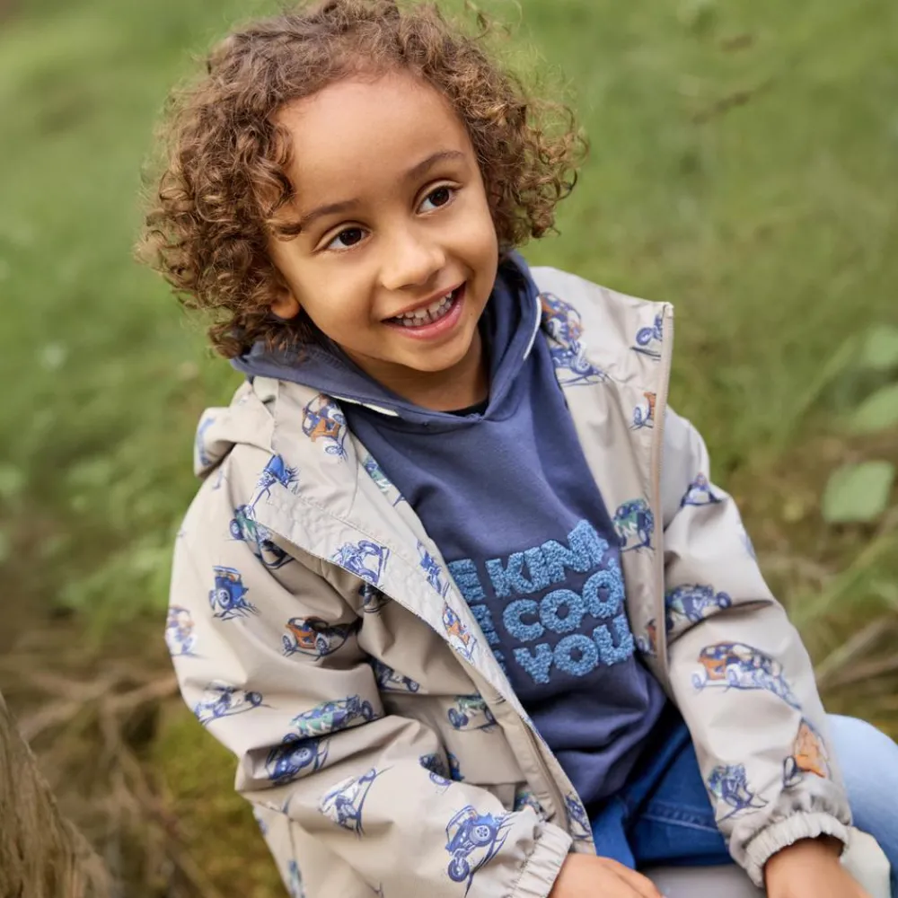 Den neutrale farve Crockery får de seje køretøjer i helprintet til at træde frem, så det er nemt at finde yndlingsjakken, når skyerne samler sig. Den faste hætte, gennemgående lynlås og elastiske kanter hjælper med at holde regnstænk og vind ude, mens to praktiske lommer giver plads til små skatte på farten. God til skolevej, legeplads og weekendture med familien.